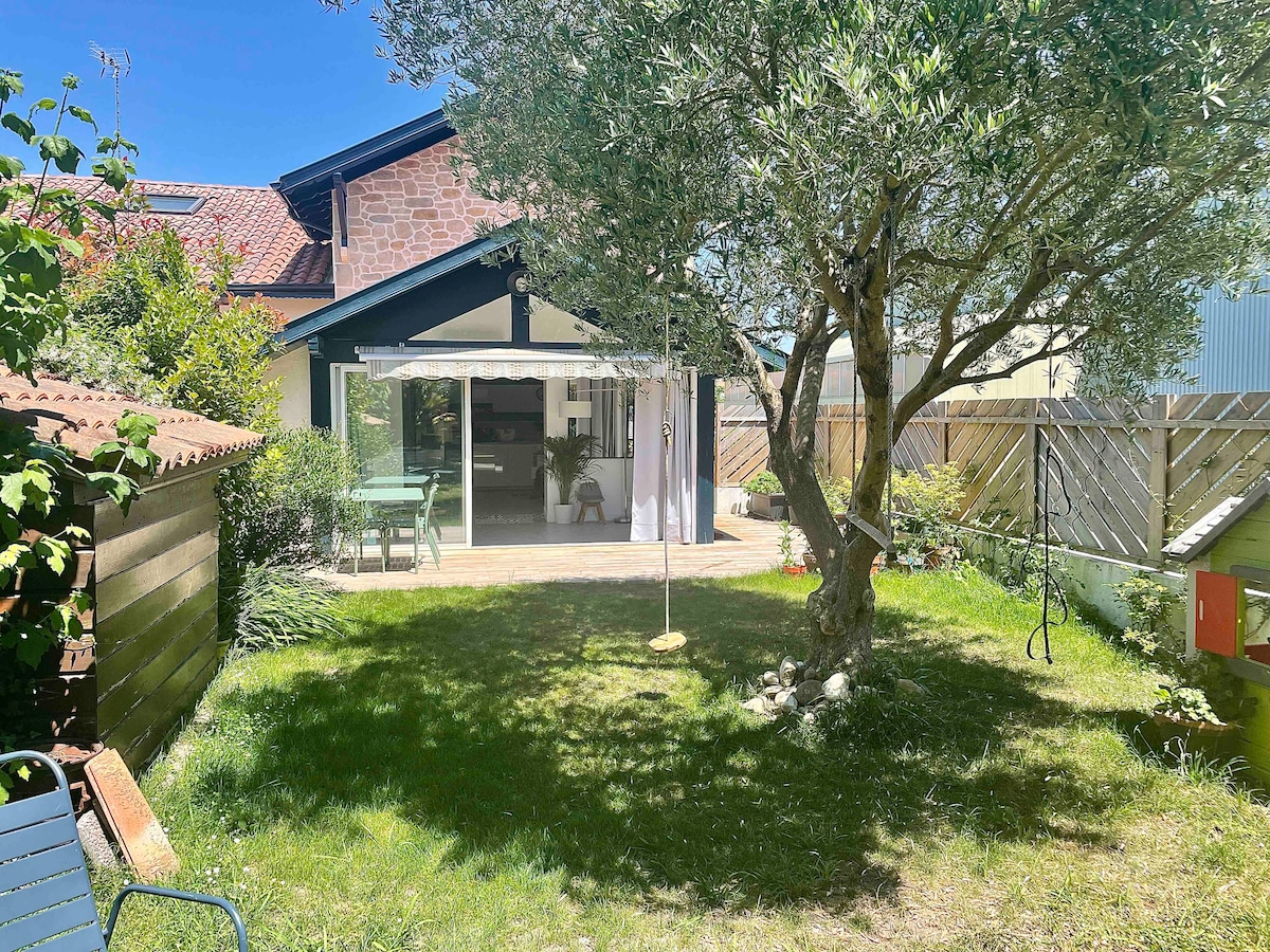 Sympathique maison de 60 m2 très bien placée à proximité du centre ville et à 15 minutes à pied des plages de Biarritz et d'Anglet. Elle est située dans un endroit très calme au fond d'une cour, proche des commerces et des transports Vous pourrez profiter d'une grande terrasse ensoleillée (30m2) et d'un petit jardin à l'arrière. La maison propose 2 chambres, un salon, une cuisine, une salle de bain et d'un parking. 3 télés, le wifi fibre, trois vélos sont disponibles.