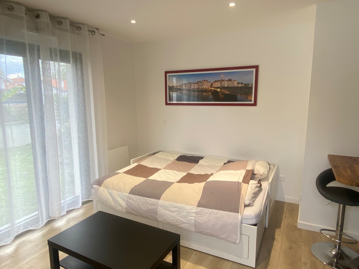 Découvrez un studio entièrement neuf, spacieux et lumineux avec un jardin privatif où vous pourrez faire un barbecue profiter d un transat au soleil. La cuisine est entièrement équipée avec lave vaisselle, four, four micro -onde, frigo et congélateur, machine à laver, Nespresso. Accès privatif dans une maison individuelle. Particulièrement bien placé en étant à 10 minutes à pied de la plage, du golf du Phare ( Biarritz) et 3km du golf de Chiberta. Proche de tous les commerces à 300 m à pied.