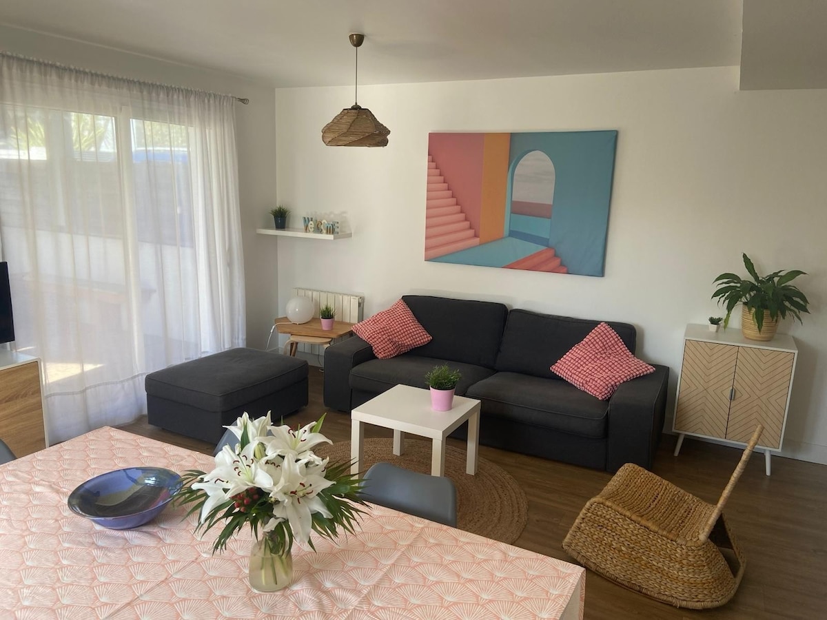 Bright 2 bedroom apartement of 54 m2 at the gates of Bayonne & Biarritz, 7km from the Atlantic Ocean, near the Basque Country, Landes beaches popular among surfers and Spain 40min by car. Bayonne railway station at 10min, airport at 20min. Bus to Bayonne, Biarritz and beaches. Quiet, ideally located, close to all shops, cinema and restaurants (- 3min by car). Located on the ground floor of our house, with private entrance and terrace, overlooking garden and forest. Hélène & Yves