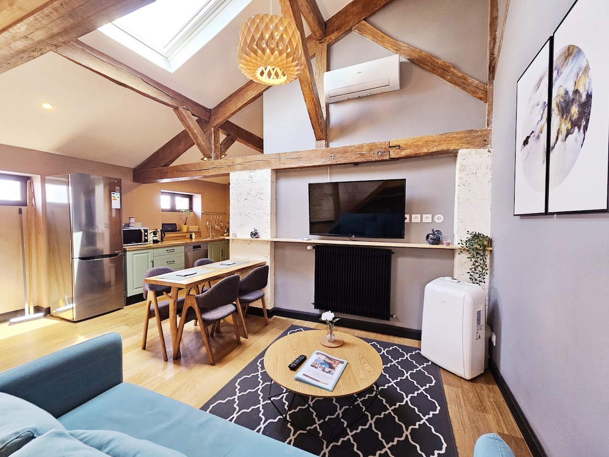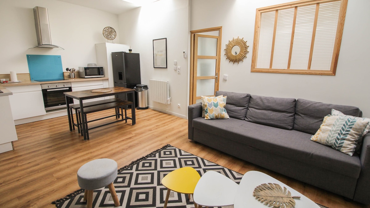 Magnifique duplex de 63m², entièrement rénové, très lumineux, parfait pour votre séjour à Angoulême. À 2 minutes seulement de la gare et 5 min du centre historique (restaurants, musées, bars), vous pourrez à la fois aisément profiter de l'attractivité de la ville et du confort de l'appartement. Literie premium, belle douche, Netflix, Amazon Prime, cuisine équipée, café, thé, draps, serviettes, tout est fourni. Il suffit de venir poser vos bagages. p.s : la 2ème chambre (grise) est en option.
