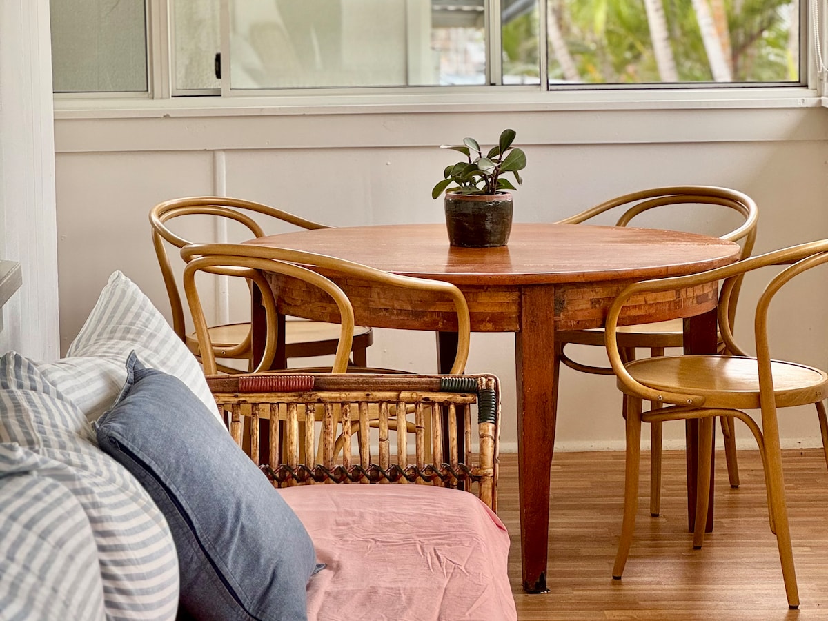 Camelot is a roomy two bedroom seaside holiday cottage with verandahs, a sleep-out (the third bedroom and the second bathroom). Walk to everything. Think of your old aunty’s home now a holiday house but with wifi. The quiet neighbourhood is mainly permanents although it’s at the centre of Yamba’s iconic beaches. It’s ideal for a family travelling with grandparents or couples and friends. The sleep-out is basic no aircon but fans: a good space for loud snorers, teens, or independent youngsters.