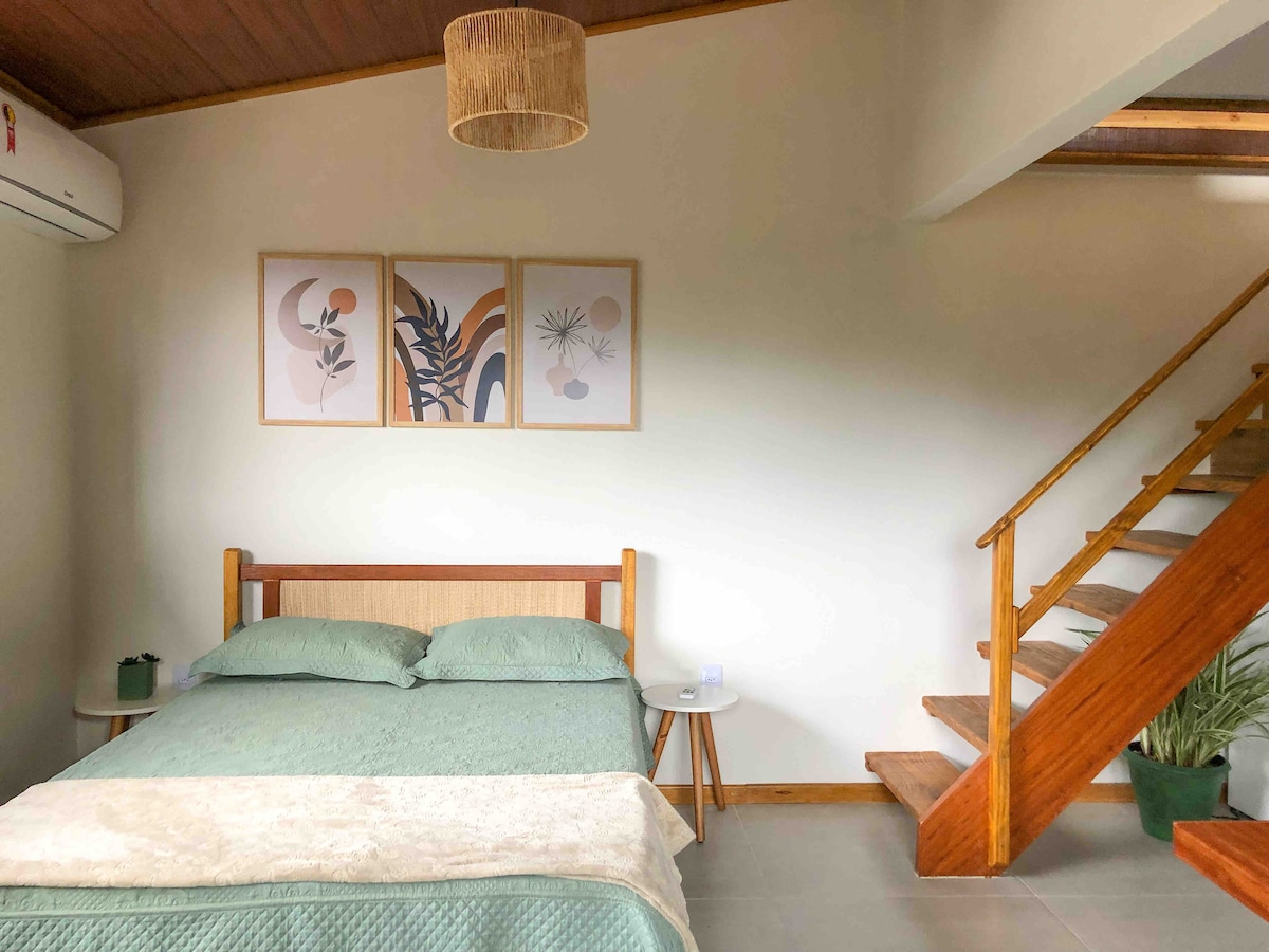 Excelente localização, sem morros. Estamos na rua principal, menos de 10 min do centro e a poucos metros da praia, onde estão os melhores restaurantes e bares. Quarto amplo e perfeito para famílias, possui uma cama de casal e 2 camas de solteiro no mezanino. Oferecemos 2 ar condicionados, wifi, frigobar, microondas, sanduicheira, cafeteira, utensílios básicos, pia, roupa de cama e banho, banheiro privativo, varal e área externa. Ambiente tranquilo, confortável. Garantimos fidelidade às fotos.
