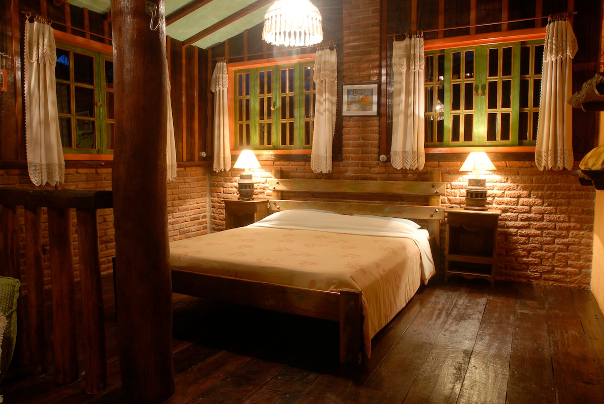 Muito charmosa e acolhedora a choupana é um chalé construído no meio da mata com material de demolição e materiais recicláveis. A Choupana tem 40 metros quadrados, cama king size, TV com DVD, Lareira , frigobar, redes, pequena sala de estar e vista pro interior de uma floresta.