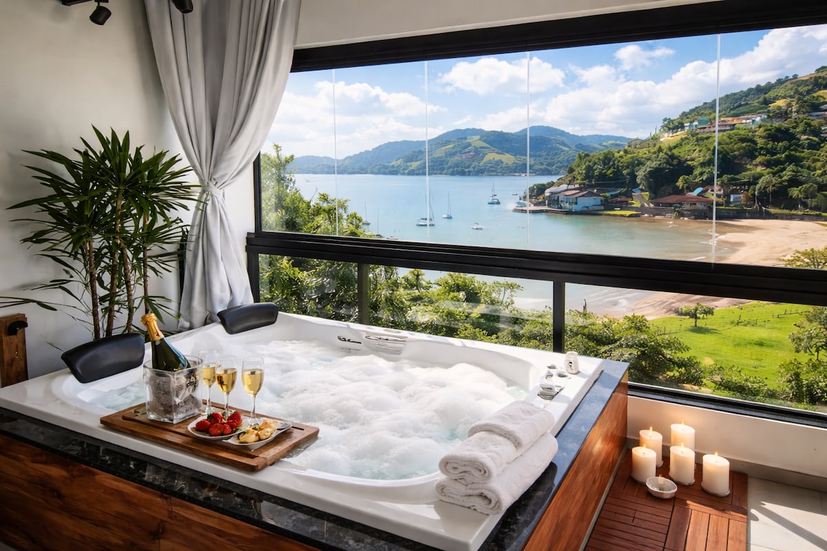 Loft de luxo com vista panorâmica para o mar em Angra dos Reis. Ambiente moderno, mezanino aconchegante e banheira com vista incrível — perfeito para casais. O grande diferencial: passeio de lancha exclusivo com o anfitrião 🚤 Explore ilhas paradisíacas, praias secretas e viva uma experiência única. Hóspedes têm prioridade na agenda. Reserve agora e transforme sua viagem em algo inesquecível!