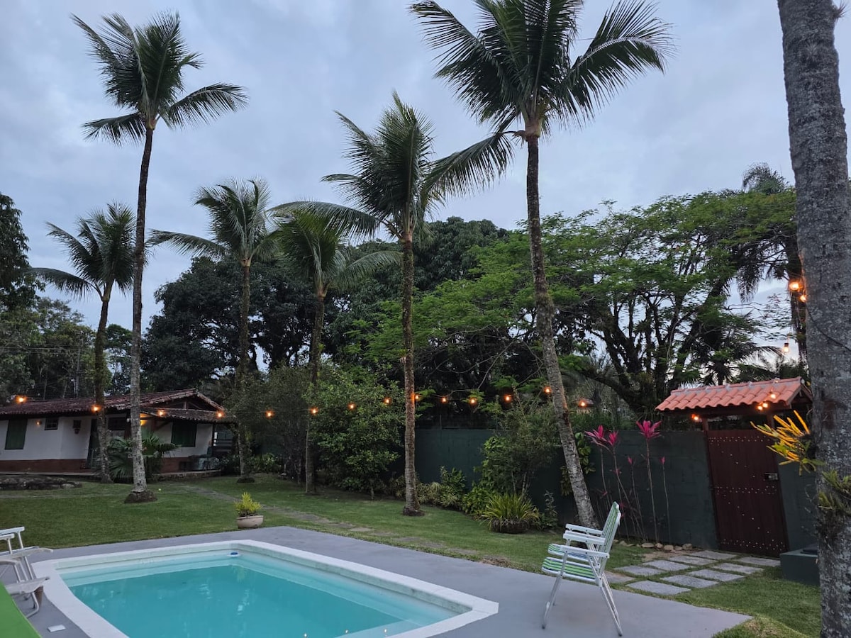 #Chácara com maior número de avaliações de Angra# Duas piscinas- uma climatizada e outra com água natural. Estacionamento privado para até 05 carros. Visual de montanha e cachoeira. Sauna à vapor com visual para cachoeira. Campo de futebol, sala de jogos, ping pong, sinuca, totó, mesa de carteado, TV. Split e ducha a gás em todas as 4 suítes. Churrasqueira, cervejeira e Frezer.Mercado próximo. Temos gerador de energia elétrica caso a rede pública caia. 15 min do Mar de Angra e próximo a Br-101.