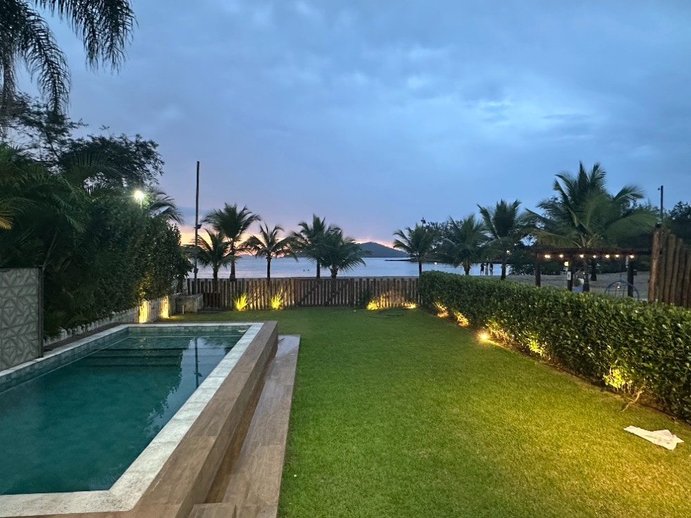 Casa exclusiva de alto padrão no condomínio Portogalo em Angra com vista deslumbrante para Ilha Grande, piscina com borda infinita, área gourmet com churrasqueira, forno de pizza, cervejeira, sinuca. São 5 suítes com ar-condicionado e Smart TV, sala ampla com TV 75”, Wifi/Starlink e cozinha completa. Condomínio seguro. Serviços extras como camareira, cozinheira, lanchas e espaço VIP com telão também disponíveis. ⚠️Importante: Pedimos que leiam a seção de regras antes de concluir a reserva.