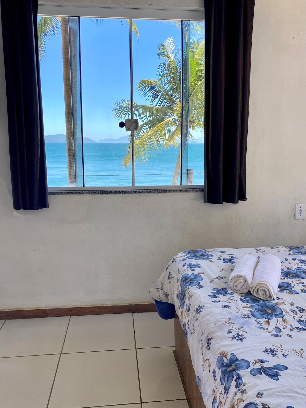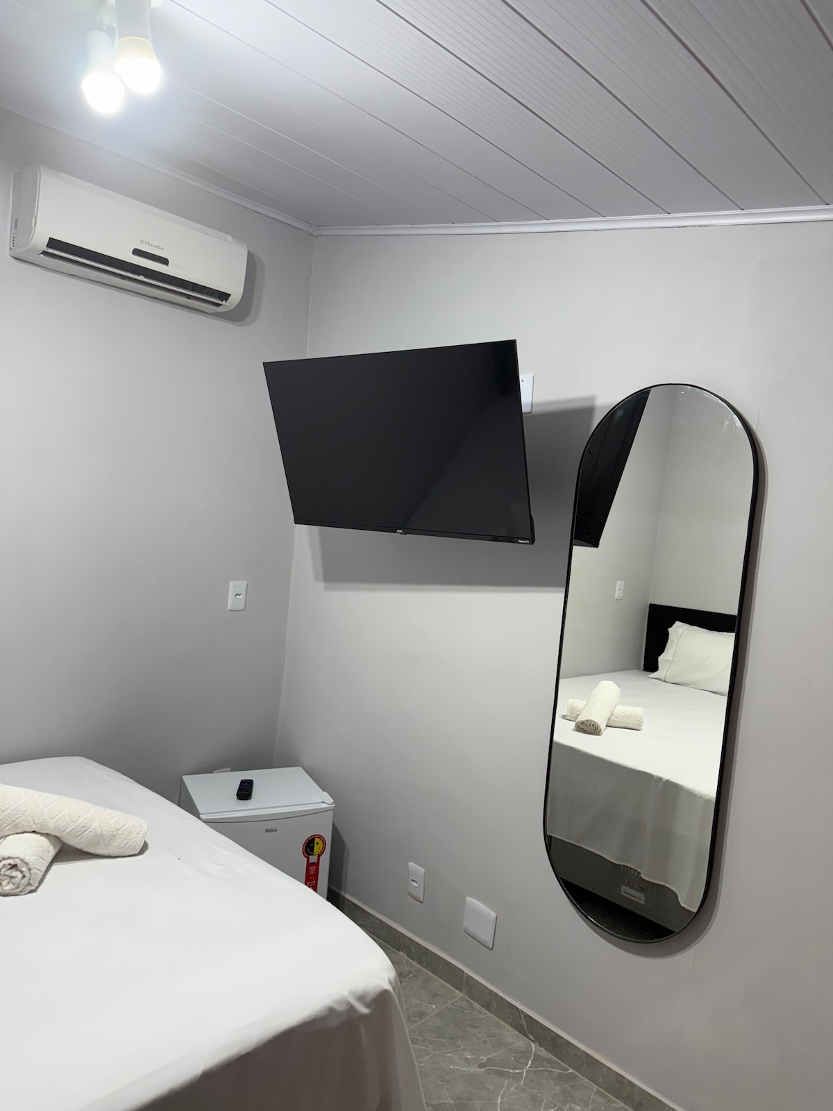 A suíte fica no segundo andar. A suíte não possui fogão, porém tem sanduicheira, cafeteira, geladeira e etc... A suíte tem uma cama de casal, uma de solteiro, ar condicionado, tv e ventilador. Suíte fica localizada no final da rua Getulio Vargas, chegando na praia do canto. o lugar é bem tranquilo, e familiar. e por isso não permitimos musica alta no espaço. Aceitamos pet de porte pequeno. Tem água quente no chuveiro. A suíte é independente