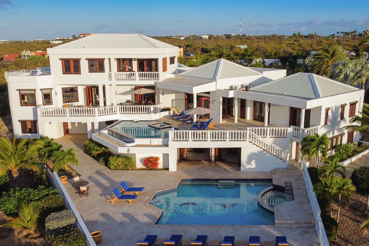 Saunter barefoot to Pelican Bay Beach from this oceanfront villa on Anguilla, and return to poolside play under the immense Caribbean sky. Situated on Blowing Point along the island's south shore, the villa gazes out on panoramic ocean views with St. Martin in the distance. A minimalist design accentuates the exquisite light and breeze, while warm wood accents and state-of-the-art appliances create a comfortable ambiance indoors. The expansive terrace is perfect for cocktail parties or carefree fun between forays to the beach. Sunbathe on lounge chairs before dipping into the voluminous pool. Play lawn games or billiards while dinner cooks on the grill, or mix delicious cocktails to sip on the veranda. The main house features an open-concept design with a chef-grade kitchen, breakfast bar, dual lounge areas, and dining table. High ceilings, large windows, and glass French doors fill the space with natural light and ocean breezes, while air conditioning and Sonos sound allow you to customize the atmosphere. The game room is located on the ground floor of the guesthouse, with a pool table and large windows gazing out to sea. Recently ranked the top Caribbean island by Travel & Leisure, Anguilla balances unspoiled beauty with some of the region's finest resorts and dining experiences. Hike the beautiful Pelican Trail or enjoy an unforgettable encounter at Dolphin Discovery in Blowing Point. Visit the superb art galleries of The Valley or hit the Greg Norman-designed fairways of CuisinArt Golf Club. Explore over 30 beaches on Anguilla or discover secluded hideaways amid the neighboring islands. Copyright © Luxury Retreats. All rights reserved. BEDROOM & BATHROOM • Bedroom 1 - Primary: King size bed, Ensuite bathroom with stand-alone rain shower, Dual vanity, Lounge area, Safe, Air conditioning, Ceiling fan, Direct access to pool, Ocean view • Bedroom 2: King size bed, Ensuite bathroom with stand-alone rain shower, Dual vanity, Safe, Air conditioning, Ceiling fan, Direct access to pool, Ocean view • Bedroom 3: 2 Twins size beds (can be converted to a king), Ensuite bathroom with stand-alone rain shower, Dual vanity, Air conditioning, Ceiling fan Guest House • Bedroom 4: King size bed, Ensuite bathroom with stand-alone rain shower and bathtub, Dual vanity, Safe, Air conditioning, Ceiling fan, Balcony, Private entrance OUTDOOR FEATURES • Ocean view • More under “What this place offers” below STAFF & SERVICES Extra cost (advance notice may be required): • Activities & excursions • More under “Add-on services” below