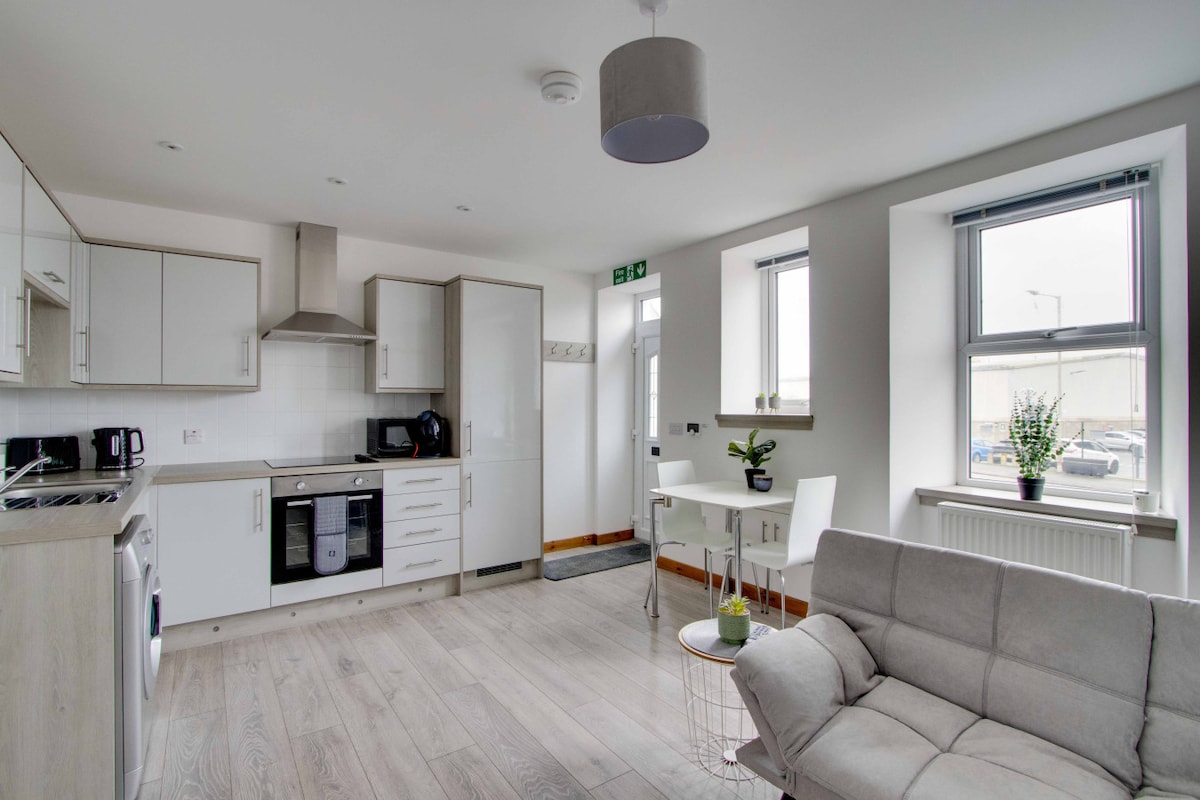 This modern flat is in the picturesque town of Montrose in Angus. 5 mins walk from a Blue Flag beach, Championship golf course and quaint high street shops. Beautiful modern flat with open plan kitchen/lounge area, 1 double bed and 1 bed which can be made single or double. 1 bathroom and private outside courtyard. Beautifully decorated. Fully equipped TV/Linen/Towels. Unrestricted on street parking. Main east coast train and bus to nearby cities eg: St Andrew’s, Carnoustie Aberdeen Dundee.