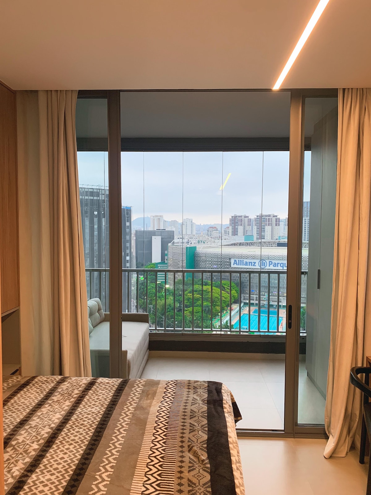 Brand new apartment, with a contemporary style, of a high standard and very well located, with a privileged view of Allianz Parque. Next to shopping malls, various businesses, means of transport, parks, tourist attractions and business buildings. The studio is complete, with a comfortable queen bed, Smart TV and Internet. Kitchen with all utensils, cooktop, refrigerator and microwave. With parking (rotary). Close to everything, cozy, perfect for experiencing fantastic moments.