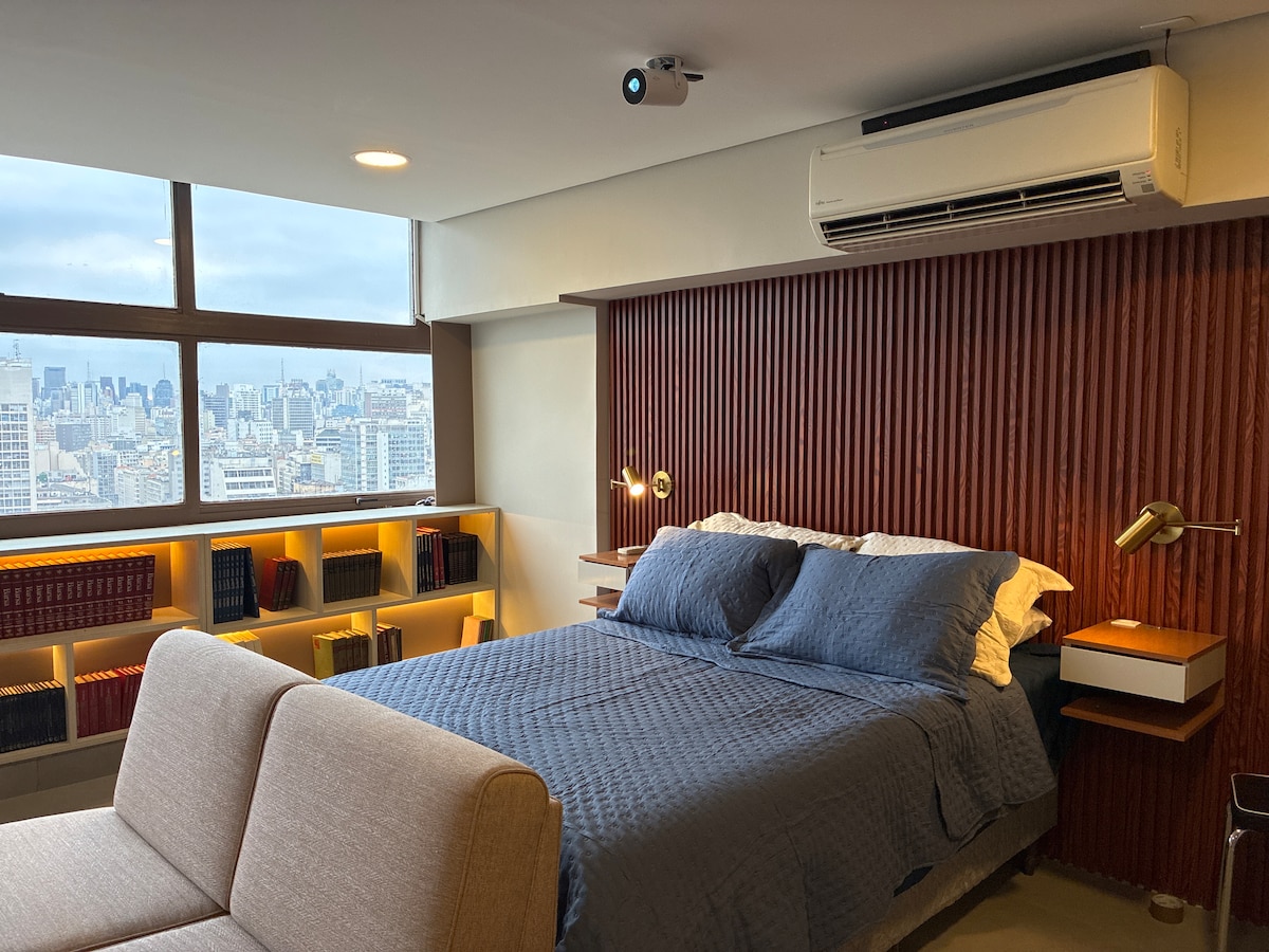 Espaço com vista impressionante São Paulo, no 35 andar do icônico Edifício Mirante do Vale — o mais alto do centro e lar do Sampa Sky. Aqui você tem segurança com portaria 24h dentro do Lobby, Galeria comercial (mercadinho, banco 24h, lavanderia e restaurantes e adega) Perfeito para casais, viajantes solo, fotógrafos e criadores de conteúdo que buscam estilo, conforto e uma experiência única na cidade. Loft possui decoração pensada para reuniões virtuais com livros clássicos e vista alta.