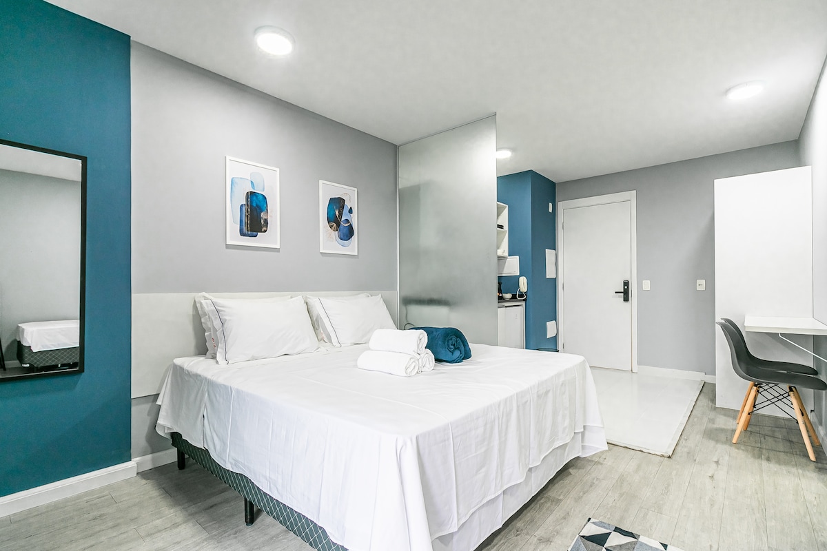 Bem-vindo ao Nosso Studio Completo e Acessível Descubra uma experiência única em nosso estúdio cuidadosamente projetado para oferecer conforto incomparável. Compacto e funcional, este espaço acolhe até quatro hóspedes. Você pode escolher entre uma configuração com uma cama queen-size e uma cama de solteiro, ou três camas de solteiro. Para acomodar um quarto hóspede, oferecemos um colchão de chão. Desfrute de uma vista deslumbrante enquanto relaxa e aproveita o que o espaço tem a oferecer