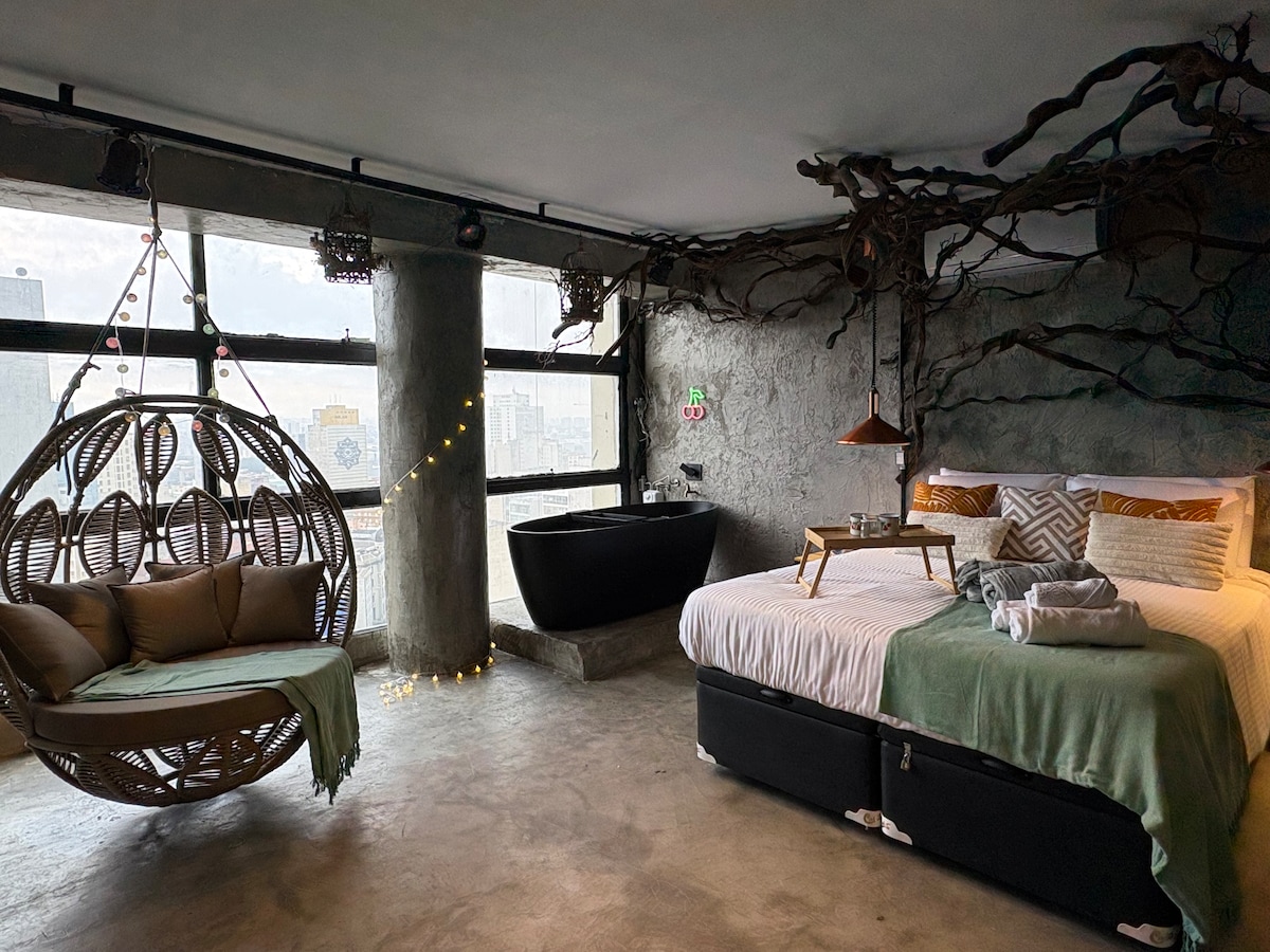 Incredible one-bedroom apartment on the 28th floor of the Copan building, with stunning sunsets year-round. King-size bed, air conditioning in both rooms, walk-in closet, workspace with 300MB internet, hammock, fully equipped and spacious kitchen, automated with Amazon/Alexa system. The most complete apartment you can find in Copan. The apartment is designed in homage to rock star David Bowie and is located in the Copan Building. Project by Yanaina Interiores.