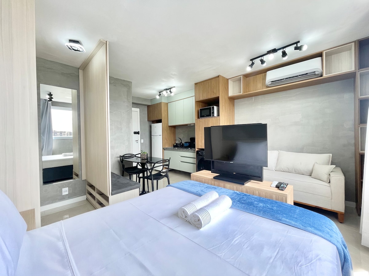 Brand new apartment, with a contemporary style, of a high standard and very well located, with a privileged view of Allianz Parque. Next to shopping malls, various businesses, means of transport, parks, tourist attractions and business buildings. The studio is complete, with a comfortable queen bed, Smart TV and Internet. Kitchen with all utensils, cooktop, refrigerator and microwave. With parking (rotary). Close to everything, cozy, perfect for experiencing fantastic moments.