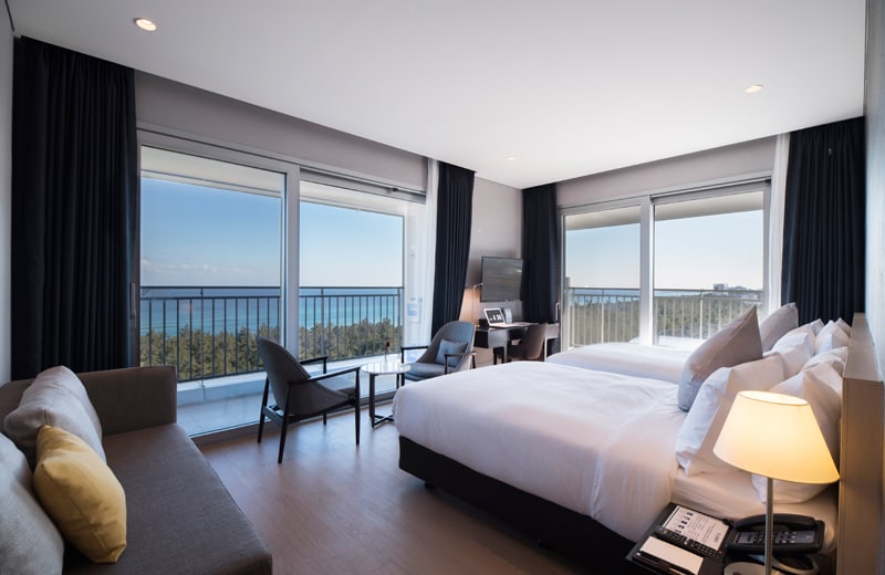 강릉행 KTX 개통으로 더욱 가까워진 2018년 1월 신축 오픈한 5성급 호텔입니다. 깨끗한 동해와 청량한 소나무 숲을 바로 앞에서 감상할 수 있는 강문 해변에 위치해, 강릉의 아름다움을 가까이서 마음껏 즐기실 수 있습니다. 야외수영장, 사우나와 스파, 레스토랑, 휘트니스 실, 키즈시설, 편의점 같은 부대시설과 편의시설을 다양하게 갖추고 있습니다. 객실은 깔끔한 화이트 톤의 모던한 디자인으로 안락함과 편안함을 선사합니다. 또한 바닥이 카펫이 아닌 원목마루로 되어 있어 청결합니다. 모든 객실 전면 오션뷰로 강릉 바다와 일출의 아름다움을 객실에서, 눈 앞에서 느낄 수 있습니다! :)
