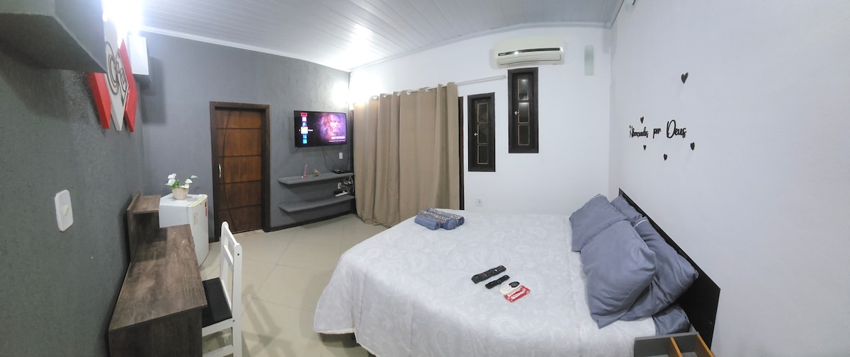 Suíte com área gourmet independente, com excelente localização, a 100 m da Rodoviária de Angra dos Reis e a 1,5 km do centro de Angra dos Reis, a 500 m da Praia do Anil, local onde são realizados as Festas e Eventos da Cidade. REGRAS: NOSSO CHECK IN É A PARTIR DAS 14hrs, SEM MAIS! NÃO PODEMOS RECEBER MALAS ANTES Fica na Av. Principal e próximo de tudo, a uns 300 m do Dom Atacadista , os hospedes terá fácil acesso a tudo o que precisar neste lugar com excelente localização. Não possui garagem.