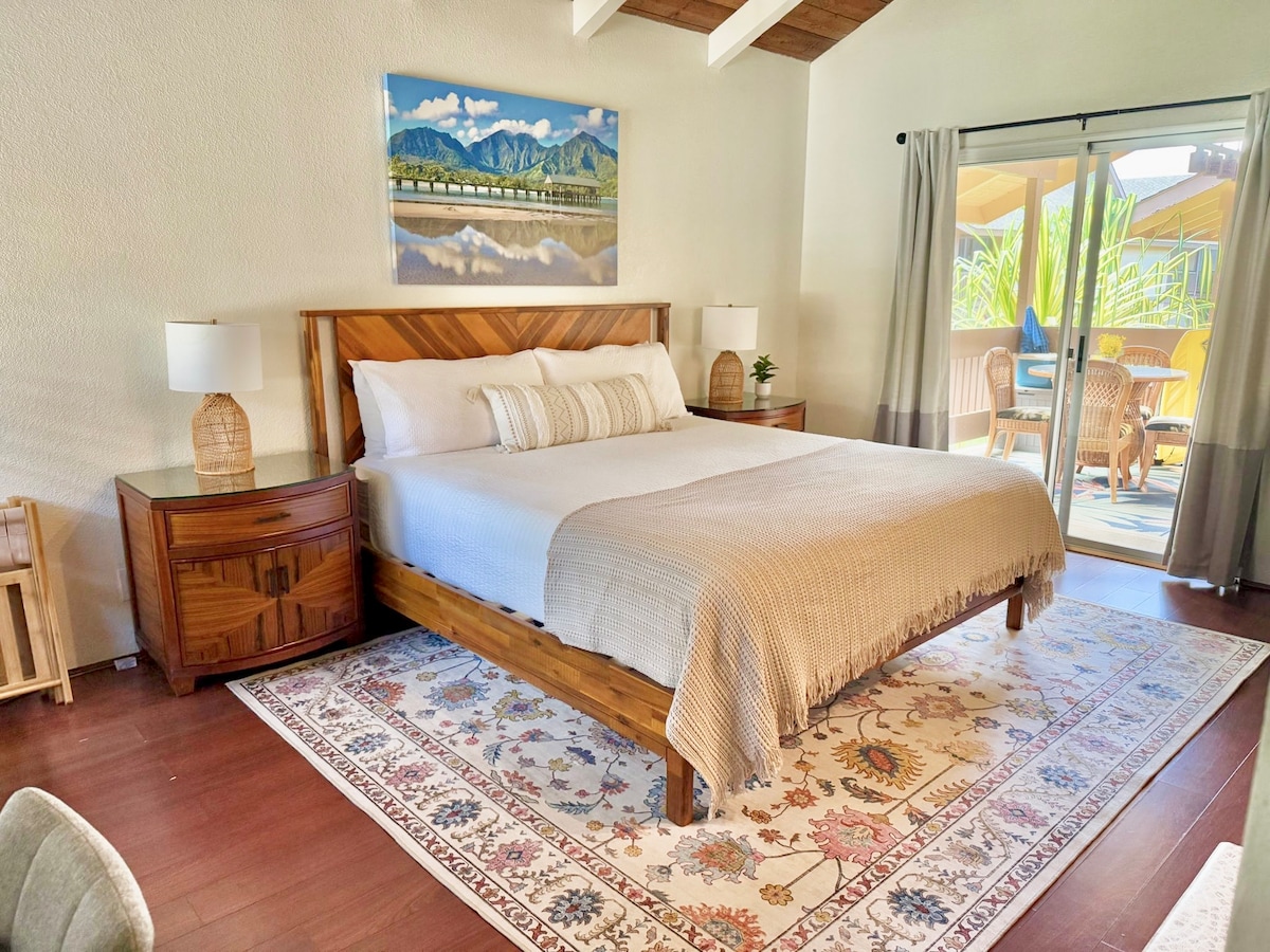 This beautiful remodeled studio is located on Kaua'i's lush and romantic North Shore. Furnished with A/C, VITAMIX Blender, Heavenly king size bed, kitchenette, hot plate, 2 flat screen tvs, and reliable wifi. Be ready to enjoy the breathtaking views and world class hiking, snorkeling, and beaches from this ideal North shore location. A quick walk to Hideaways Beach and Queen’s Bath and short drive to Hanalei. It’s more than just a vacation home, it's paradise!