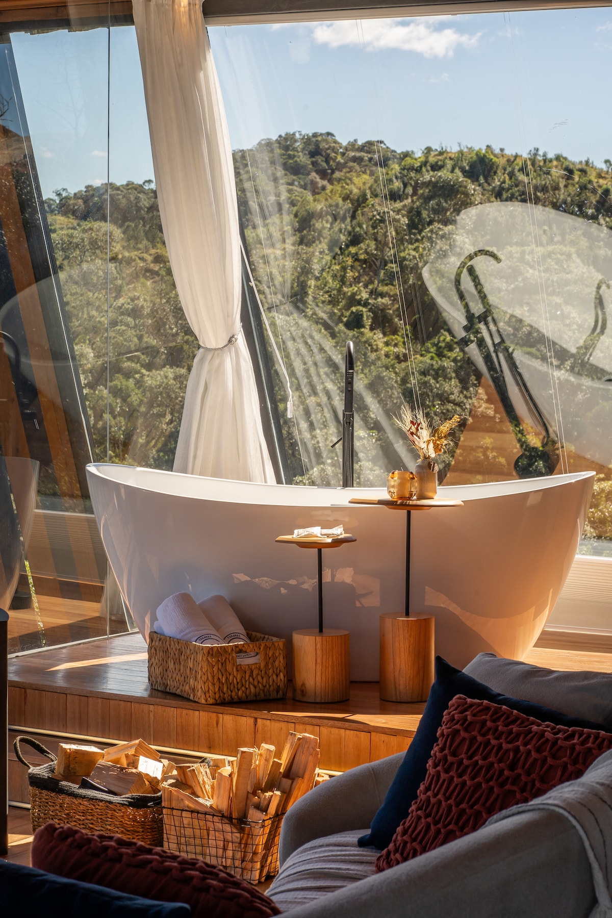 Neste espaço tranquilo e cheio de estilo você pode relaxar na jacuzzi tendo a frente um por do Sol espetacular, a Cabana possui cozinha completa, calefator a lenha, ar condicionado, Wi-Fi e TV. Estamos a uma altitude de 1200 metros com uma vista incrível para o vale e as montanhas.
