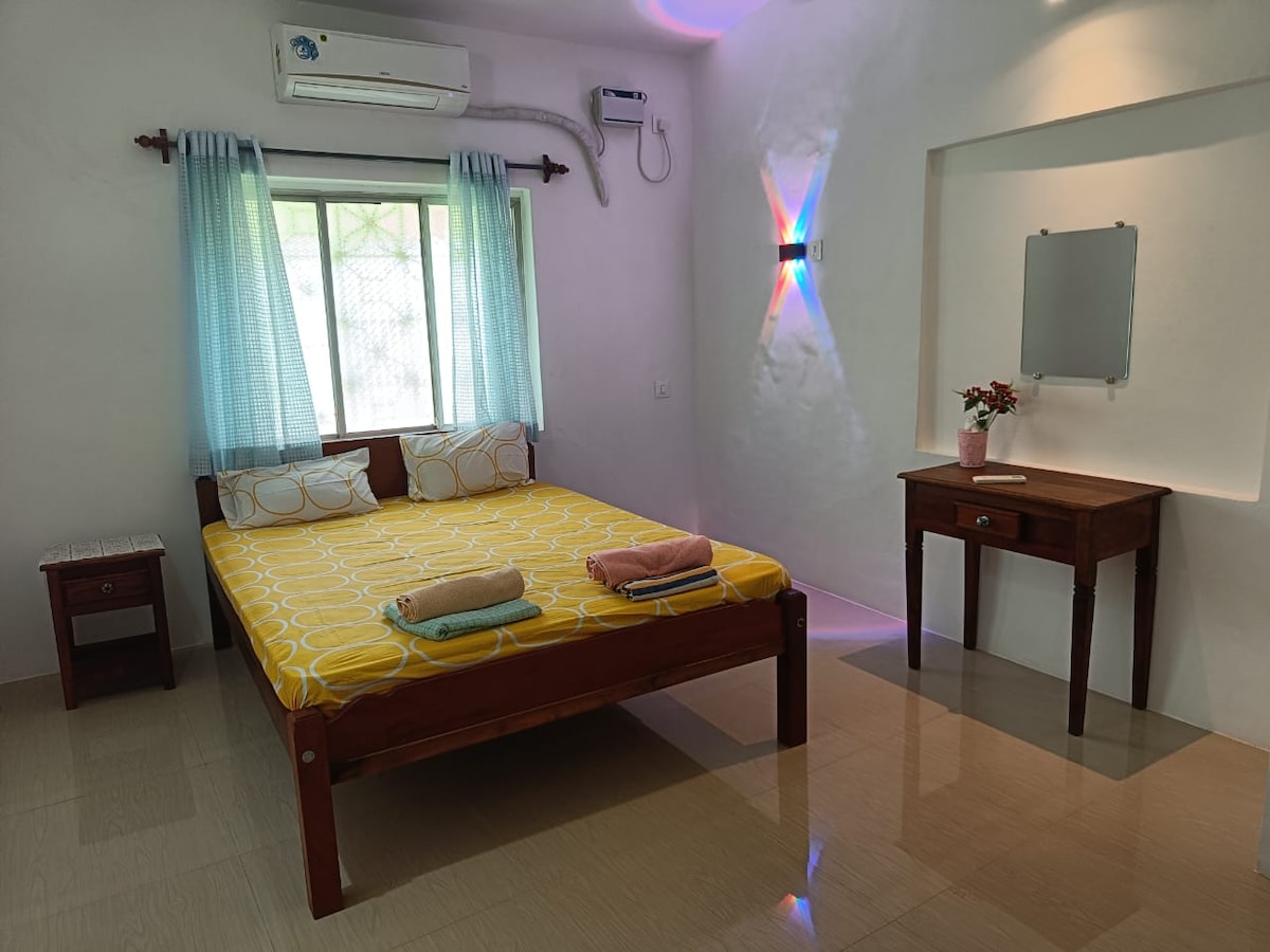 Sanitizing is important to us. We will not mingle with guests.Private gated green property with flowering and fruit bearing plants/ tree's as well as two lawn's and a sit out. Close to the main road yet far away from the bustling noise, restaurants and shops all within walking distance.A 5 minutes walk to the beach. Come relax.!The room is sanitized after every guest checks out,as per Airbnb norms. You are responsible for room house keeping,keep the room clean.Details of listing please read.