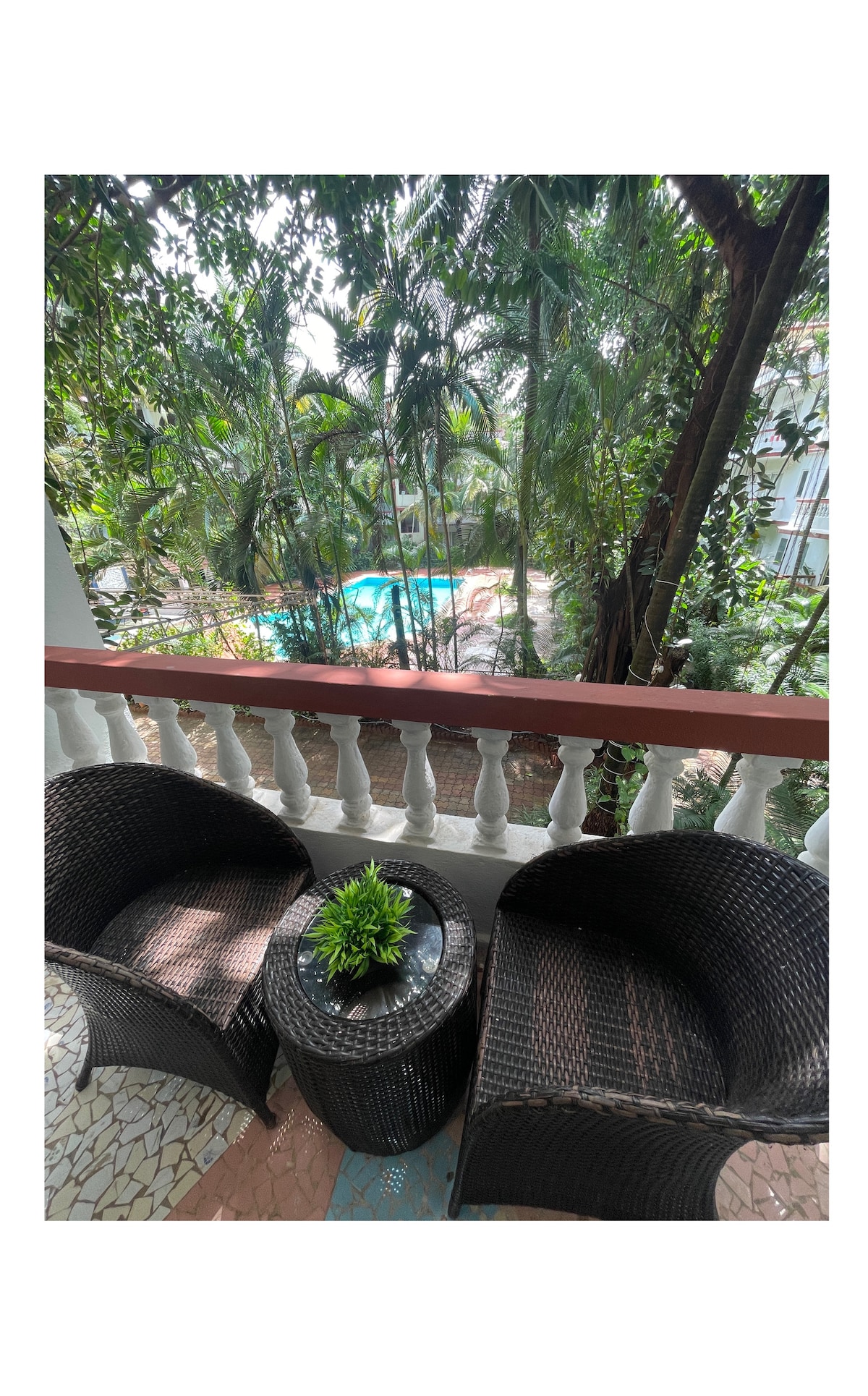Royally designed Cozy 2 BHK apartment with Poolview Balconies in the most popular society of Anjuna Vagator. It's a well-lit & completely furnished flat with Fast Wifi & functional kitchen. Each room has AC, pool facing balcony. The society has 24/7 security with CCTV cameras. Situated within 1 km to the Anjuna and Vagator beach. Food trucks, Supermarket and shops are outer side the society. Very close to famous restaurants, clubs, and Bars. Sunburn Festival is within walking distance.