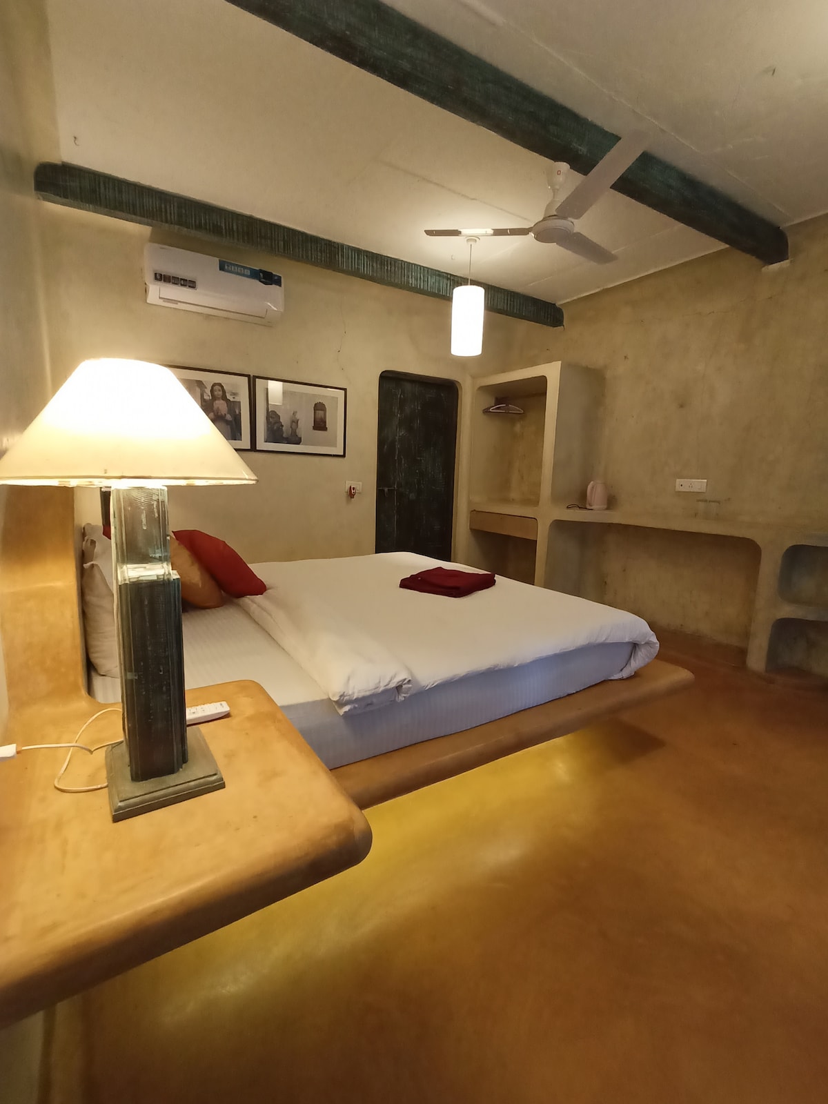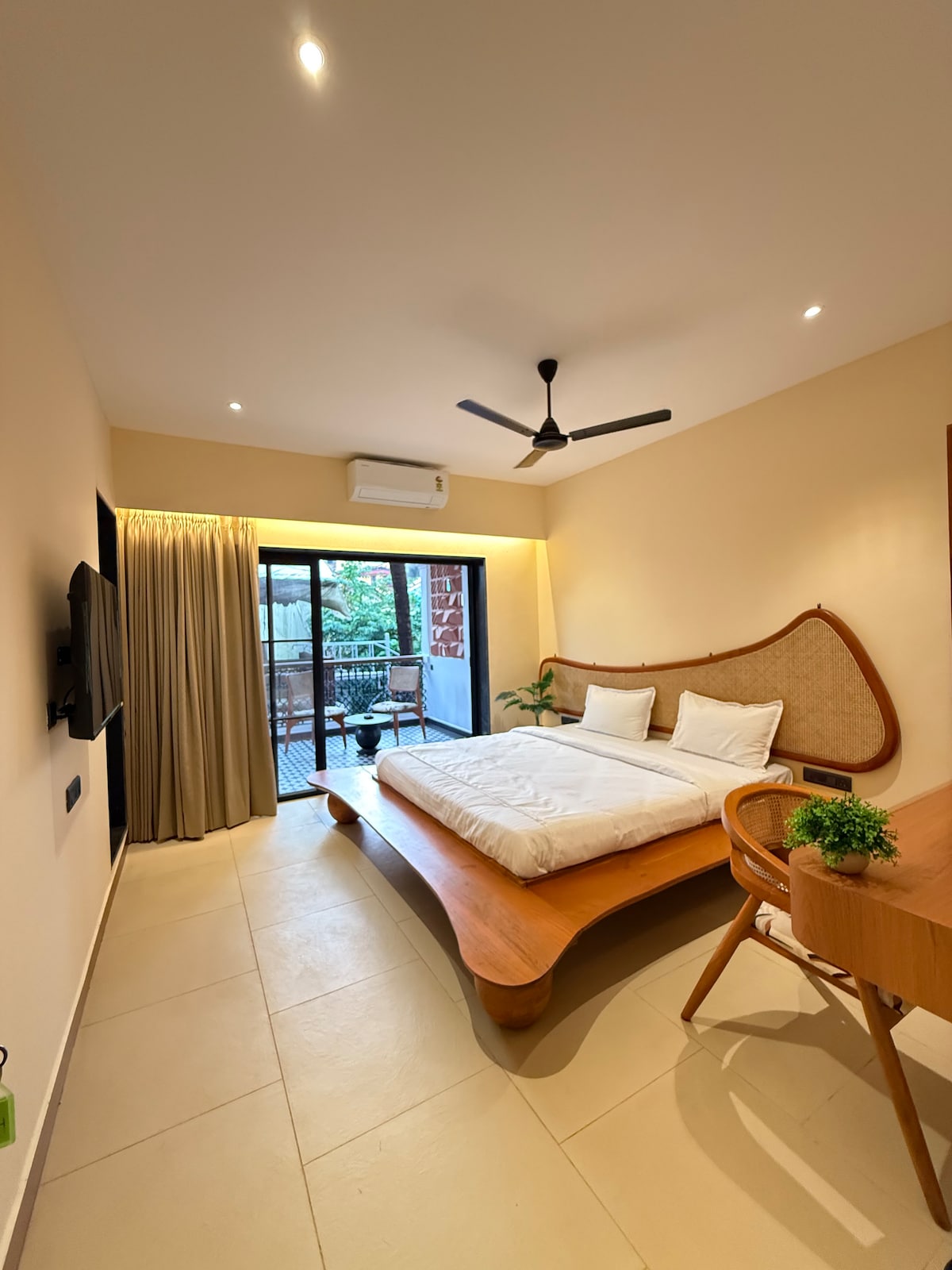 Our Signature Room is a design-forward space featuring a King bed, an open to sky bathroom, and a bathtub blending comfort with thoughtful aesthetics. The room is equipped with high-speed Wi-Fi, air conditioning, and a smart TV for a seamless stay. Located just 1.5 km from the beach and 900 meters from the local market, the property offers easy access while remaining a peaceful retreat. Our spaces are intentionally designed to foster community, creativity, and authentic travel experiences.