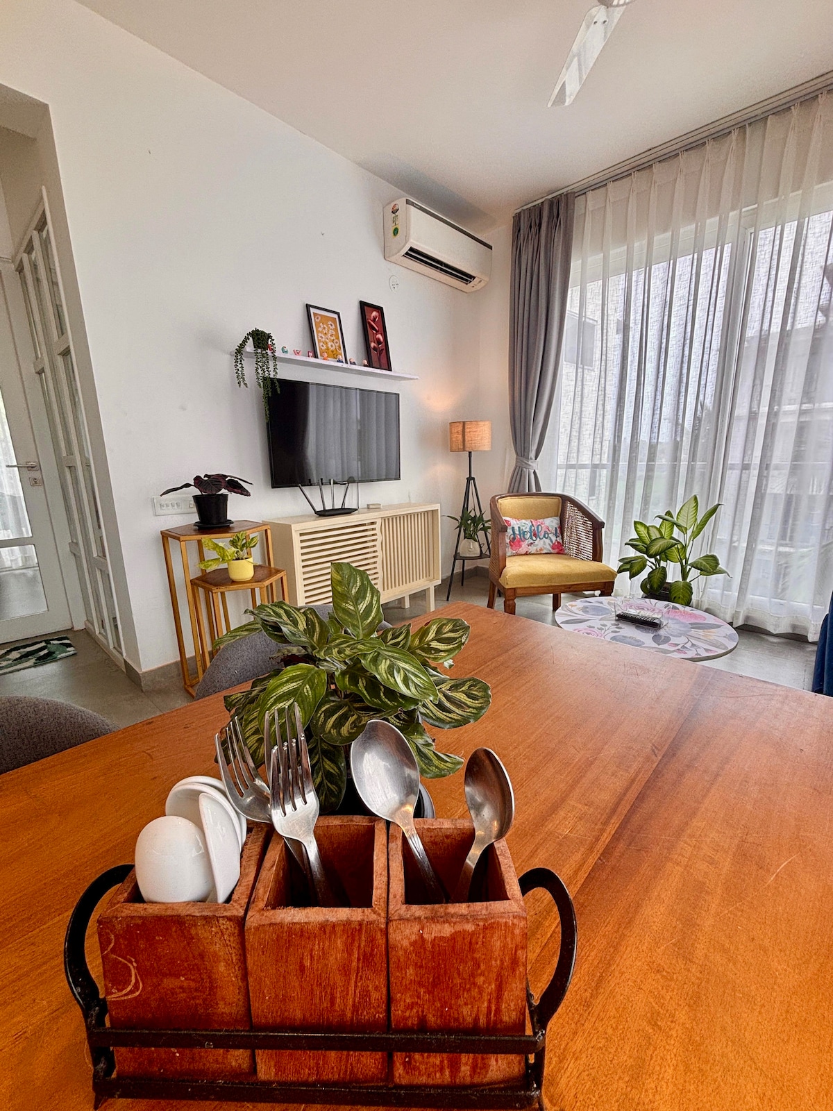 Eze by Earthen Window is a light-filled 1-bedroom duplex penthouse in Siolim, inspired by the calm, elevated charm of French hillside village by the same name. Thoughtfully styled with soft whites, warm wood, and curated details, the home features a cozy attic and a private garden terrace opening to uninterrupted green views. Set within a secure gated community with a pool, cafe, elevator, and high-speed Wi-Fi, it’s designed for quiet mornings, slow evenings, and effortless Goan living.