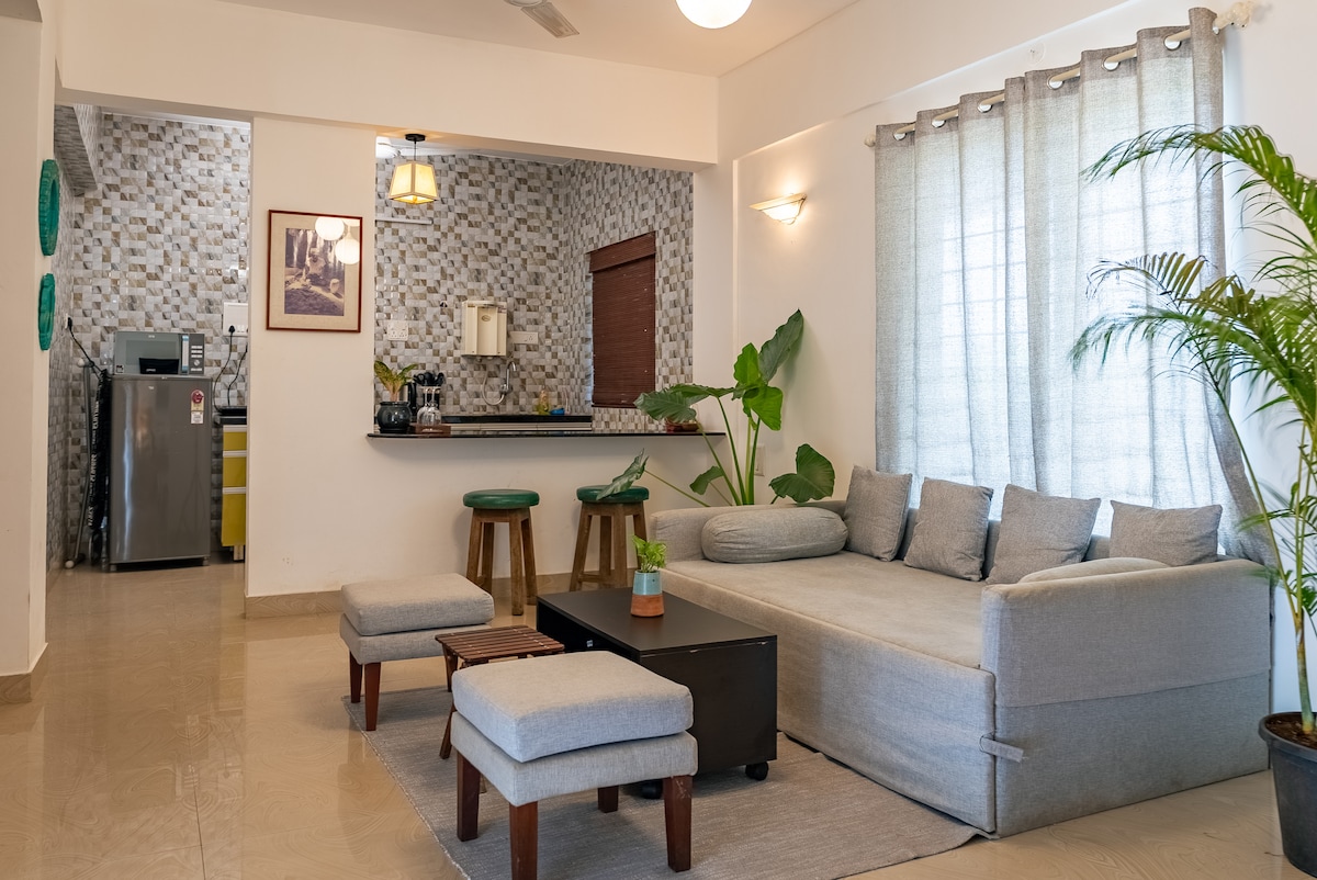 “La belle vie” meaning a Beautiful Life, is our attempt to capture the journey through a serene stay experience. La Belle Vie is a 2 BHK luxurious and chic apartment in the heart of the city yet distinctly peaceful and resting in the lap of mother nature. This high-end 2BHK apartment, nestled amongst lush green and quietness from busy Anjuna, yet within 5 min drive from all the happening places of the town i.e. Purple Martini,Raeth,Thalasa, Sunburn etc.and the beautiful beaches.