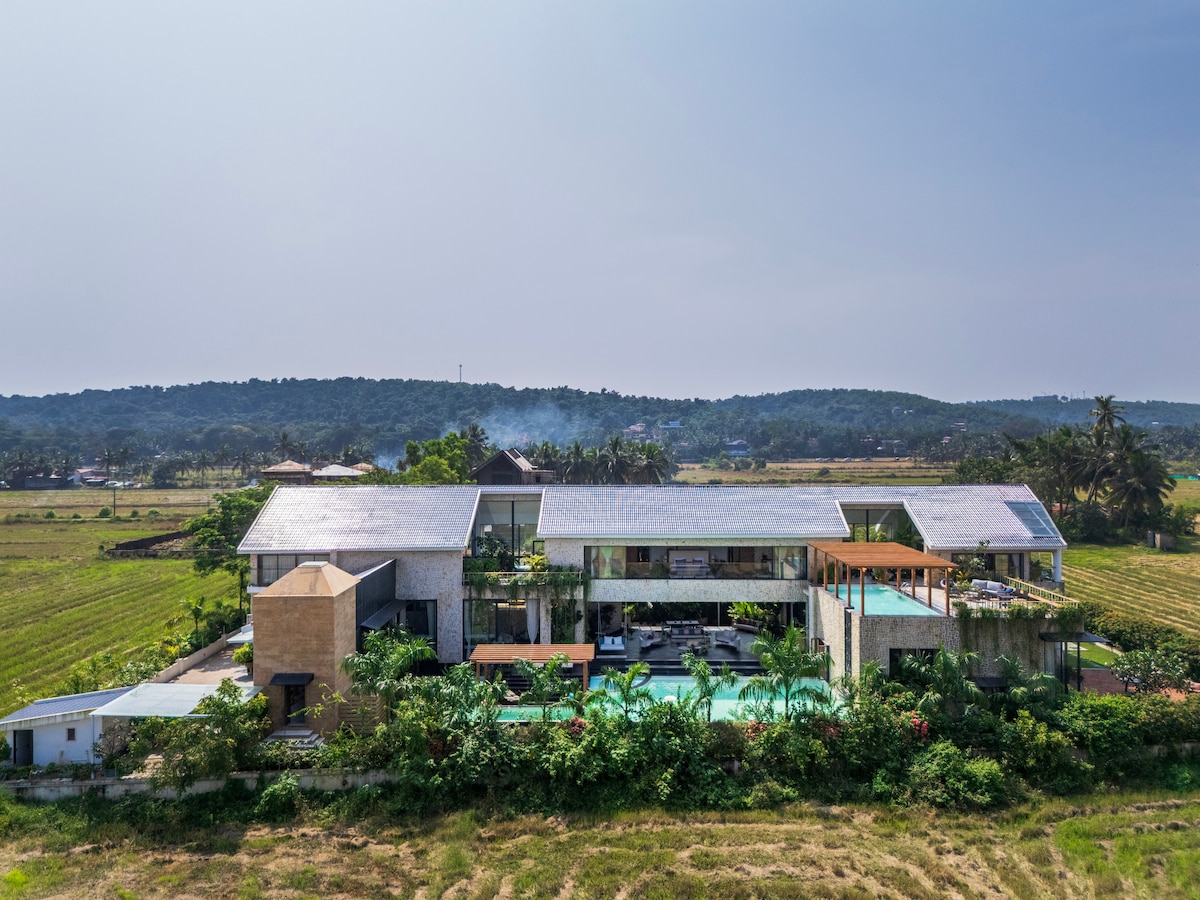 Villa Amarelo , North Goa The Boho-luxury private pool villa stands at a calm private location with the view of the lush greens of the hills and the paddy fields at the rear and stunning sunsets at the front.Located 30 mins from the new MOPA airport , a 10 min drive away from the closest beaches and a 5-min drive from the Chapora river banks, the villa lies at the centre for travellers willing to explore the beaches at Morjim, Ashwem, Arambol, and Vagator, Anjuna, Baga, Calangute alike.