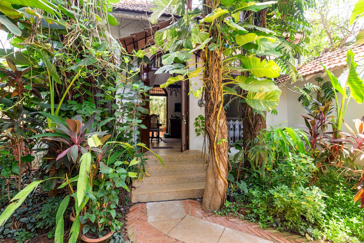 Live in a serene and magical garden in a house-with-a-loft. Situated in a quiet neighbourhood close to all the action that Goa has to offer. Our place is within 2 km of a number of restaurants for all budgets, night clubs and spa/massage treatment centers. The beaches of Vagator and Anjuna are 2-3 kms away where you can find water sports and shops. You’ll love our place because of the outdoors space, a comfy bed, and a unique layout. Our place is suitable for couples and families (with kids)