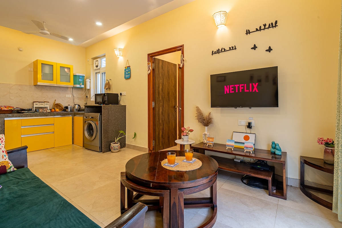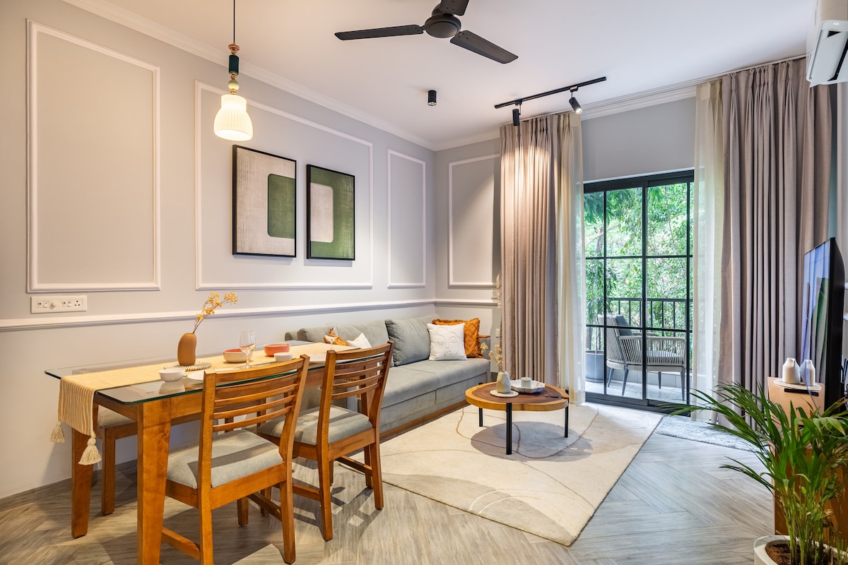 Modern Boho Apartment | Minutes from North Goa's Beaches.A cosy, fully furnished 1BHK retreat perfect for couples, friends, or small families. Highlights: - Stylish boho interiors with a warm vibe - AC in bedroom & living room for comfort - Smart TV + High-speed WiFi - Equipped kitchen with RO water, cooktop, fridge & washing machine - Shared swimming pool (9 AM–6 PM | swimwear mandatory - On-site gym available as a paid facility - 24/7 security for peace of mind - Free Parking