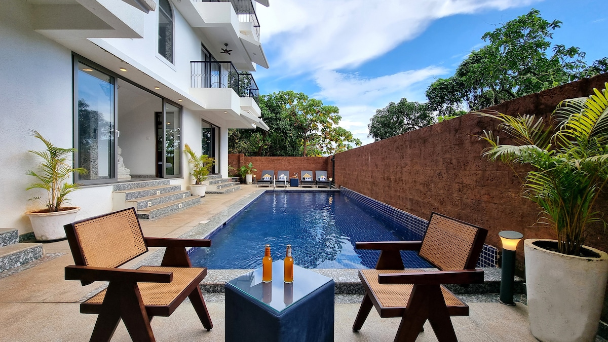 Luxury Private Pool Villa near Anjuna, Vagator Beach, Villa Divino is a chic 2.5-bedroom private pool villa in Anjuna, tucked into a lush, quiet green belt yet minutes from Goa’s hottest cafés, beaches, and nightlife. Just 1.5 km from Vagator Beach, Short drive to Anjuna Beach, right next to Assagao, easy drive to Morjim, Ashwem, Candolim and Baga, this bright villa sits in an exclusive gated compound, with 24/7 security, a private plunge pool, and a hill-view terrace in North Goa!