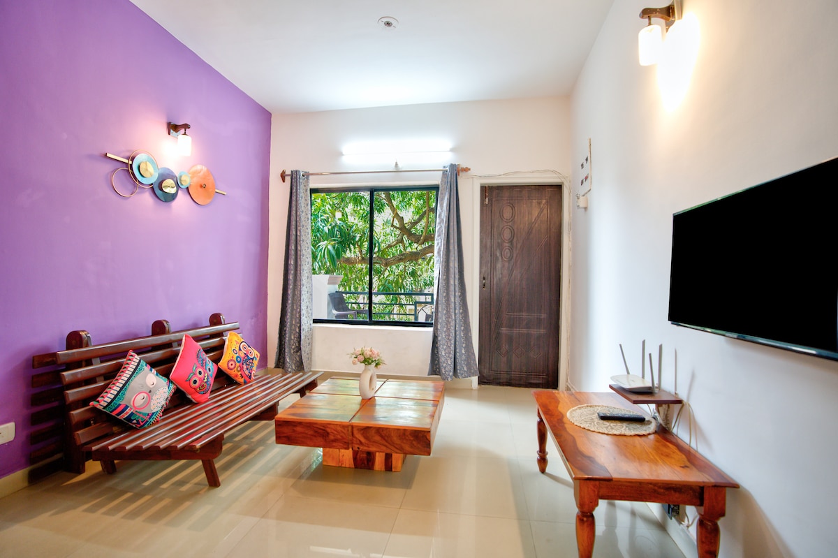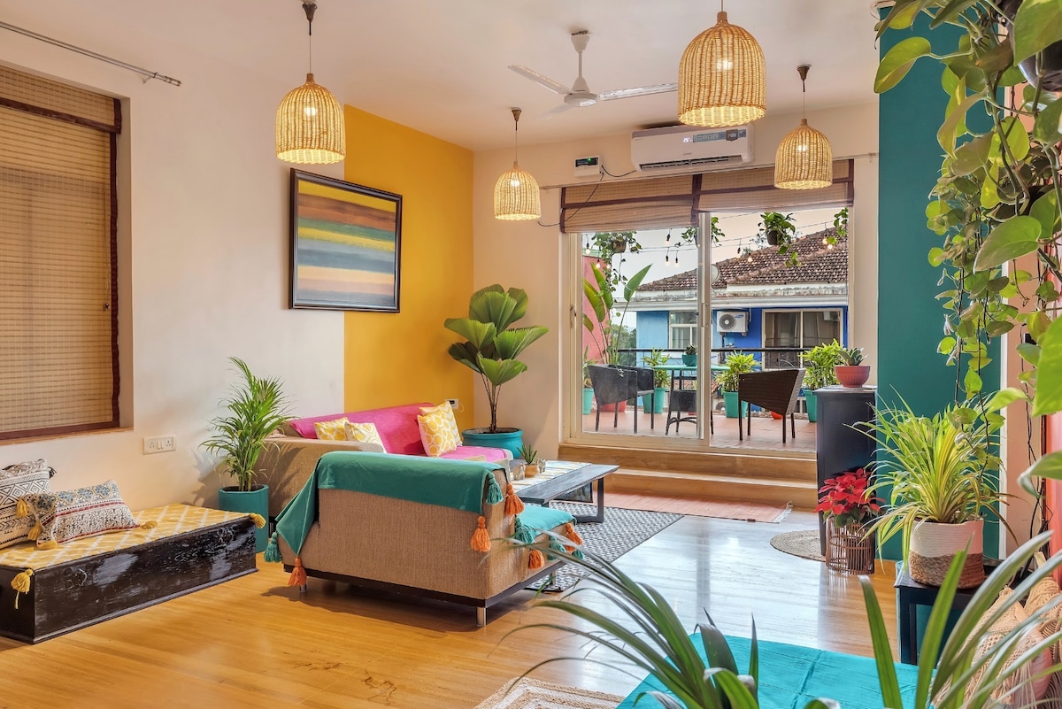 A hidden gem tucked away in Panjim's poshest zip code. Our 2BHK penthouse has a private terrace and is a short walk from Miramar beach. A Goan sanctuary surrounded by greenery; the open-plan, sprawling living room transforms into a chic space after sunset with designer ambient lighting. The famous promenade, grocery stores, and cafes are just a stroll away. Fontainhas & casinos are a short drive away. Enjoy high-speed WiFi if you’re working from home. PS: Look for peacocks in the morning!