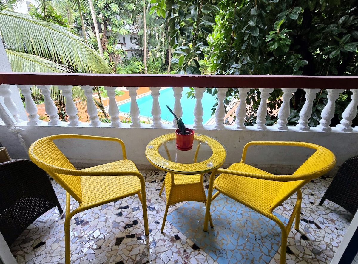 Superhost Swaroop's stylish pool-view studio is a dreamy escape for couples. Wake up to the serenity of lush greenery, sip your morning coffee by the pool, and dive into a day of relaxation. Whip up your favorite meals in the fully equipped kitchenette & indulge in delightful dining. Need to work or create? The inspiring workspace is perfect for fueling your ideas. With best clubs and the iconic beaches of Anjuna, Calangute, and Baga minutes away—your perfect Goa getaway starts here! Cheers:-)