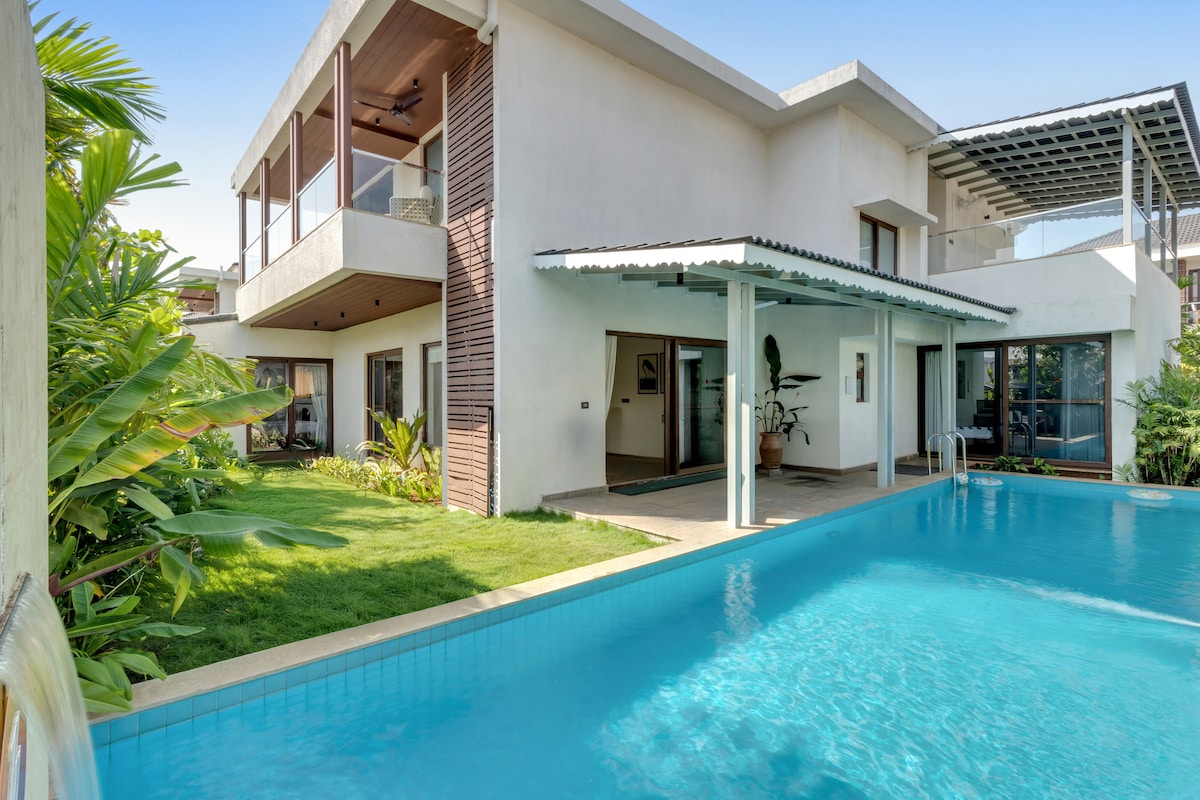 "Sunsaara Poolside Villa” Exquisite, Elegant sun-drenched & east-facing. The spacious living area exudes an air of exclusivity, with plush furnishings and tasteful décor that seamlessly blend comfort and style. Pristine crystal-clear pool is surrounded by a lush green lawn. When the sun sets, the villa transforms into a haven of romance. The villa's east-facing orientation means you'll have a front-row seat to the stunning sunrise each morning and the moonrise at night with a candlelight dinner.