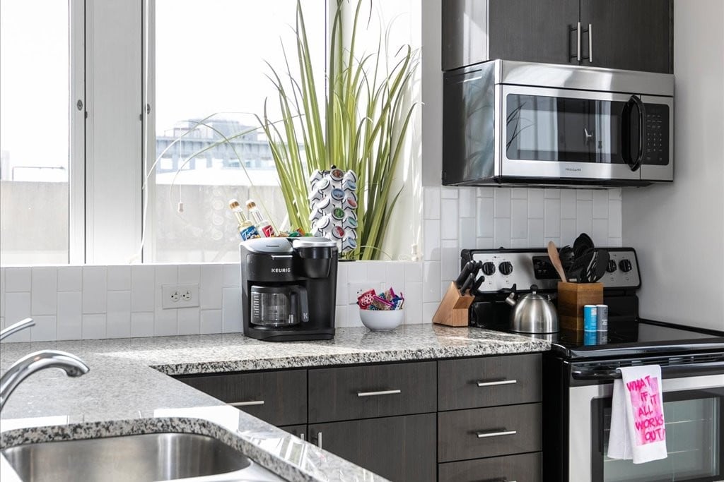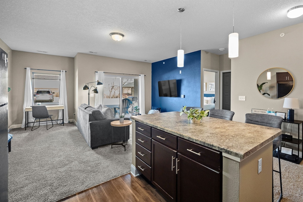 This 2BR/2BA end unit is full of natural light. A perfect place for business, or family travelers. This spacious design will leave you plenty of room to breathe. Featuring an oversized island/breakfast bar, full size laundry, king bed, 2 full beds and a spacious living room. Come enjoy your next home away from home and lets us do the rest. This unit also comes with a one car garage and unlimited lot parking, high speed WiFi in unit w/complimentary YouTube TV, and chef ready kitchens.