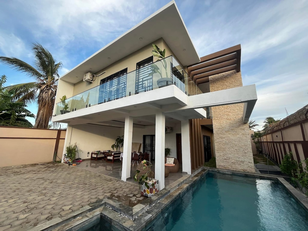 Résidence Calme. Un havre de paix pour s'évader de la vie quotidienne. Offrez vous un séjour inoubliable. Nous disposons de 2 suites climatisées, 1 chambre ventilée avec salle de bain attenante. Une cuisine intérieur équipée ouverte sur un salon spacieux. Un espace extérieur zen offrant une grande terrasse couverte sur une piscine, une cuisine exterieure bien équipée avec barbecue. Bien évidement femme de MÉNAGE, WiFi, TV et Gardiennage inclus.