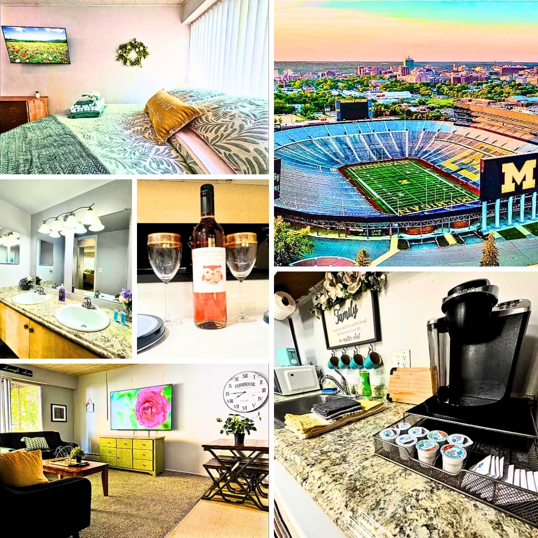 Guest favorite! Spotless and perfectly located 2-bedroom apartment. This deluxe experience offers every convenience - a new premium mattress, 50" flat screen TV, fully equipped kitchen with high-end appliances, sleek furnishings, and secure entry. A 5 minute walk to The Big House, downtown and central campus are moments away. The city's urban bike path is right down the street. Don't miss the chance to make your visit unique.