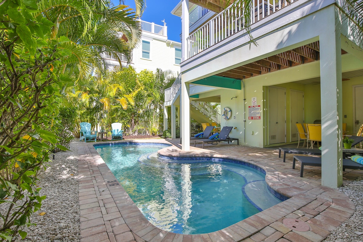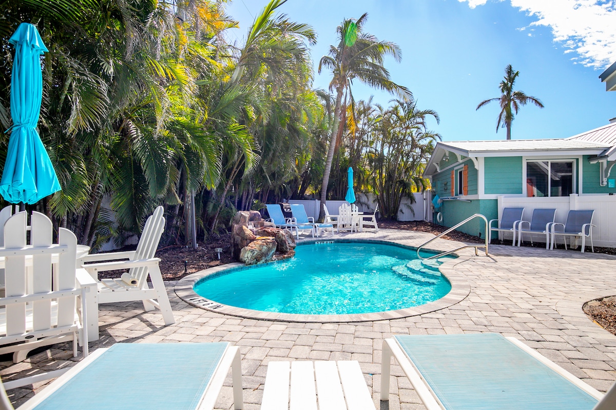 Back Open Jan '25! Located just 200 steps from the beach you’ll have your feet in the sand in no time. A comfortable living area + fully equipped kitchen. Furnished with island décor and local art. Everything you need including a heated pool, large patio with a Tiki hut, tropical gardens, plus a private outdoor area with a shower for your comfort. Walk to everything – grocery, pharmacy, ice cream, breakfast, pizza, donuts, and the beach which is less than 2 minutes away.