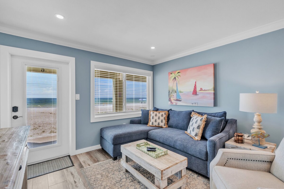 You only have to go down 14 stairs from your second-floor beachfront condo to have your toes in the powder soft sand. A queen size bed with a soft mattress in the bedroom and a queen size pullout couch in the living room. Full kitchen in the unit and laundry available downstairs. Cable and high-speed internet included. One assigned parking spot. Enjoy the sunset from your balcony as it sinks into the Gulf. Perfect for a romantic couple getaway or bring the kids for a fun stay at the beach