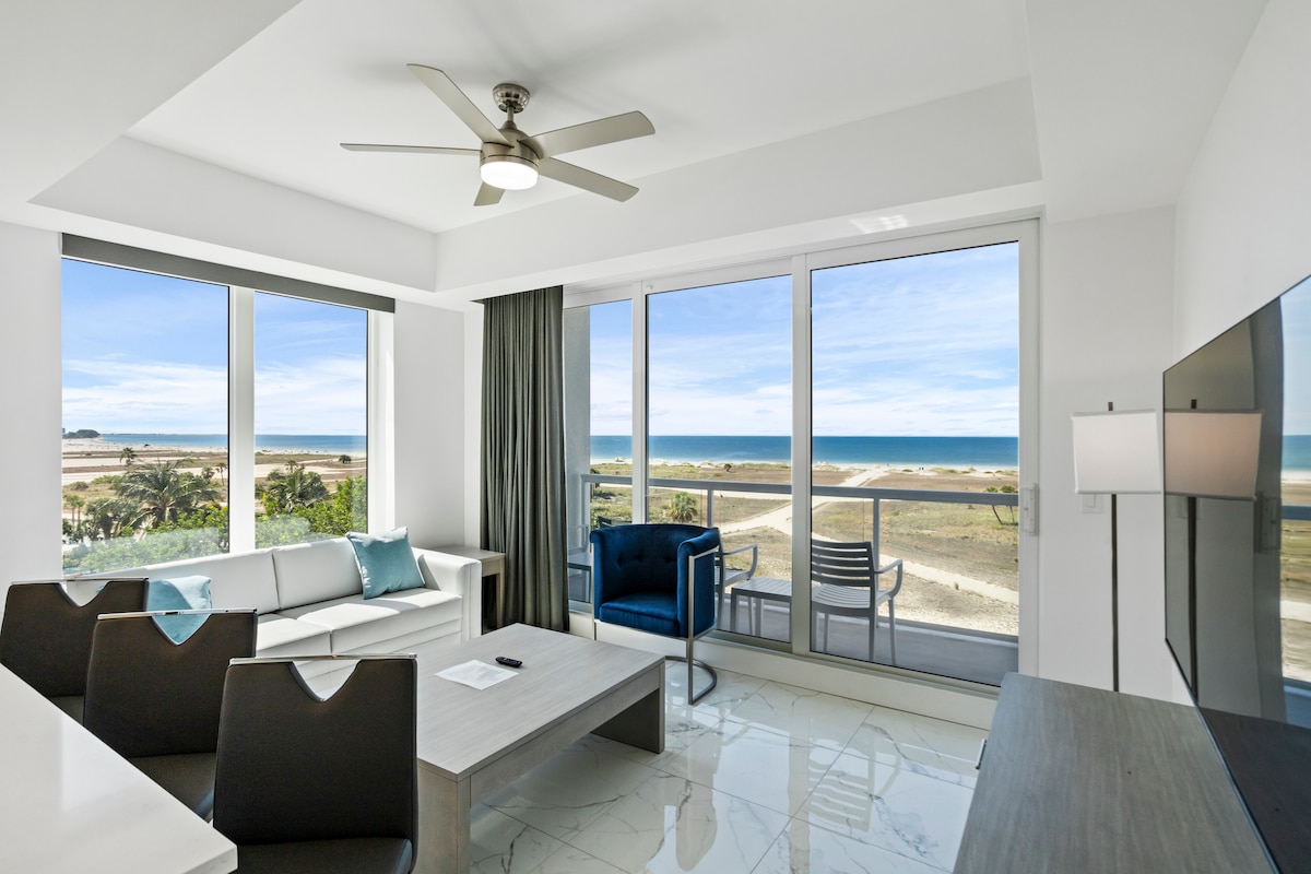 Be among the first to experience this new condo resort. 992 sq ft of beachfront luxury with full resort amenities. These upper-floor corner units have gorgeous views of the ocean, and each room has a window with beach views. With 2 bedrooms and 2 bathrooms and a pullout couch in the living room, these units can comfortably house 6 people. After arriving in your open concept living area, you will access your private balcony through retractable sliding doors that let the ocean air in.