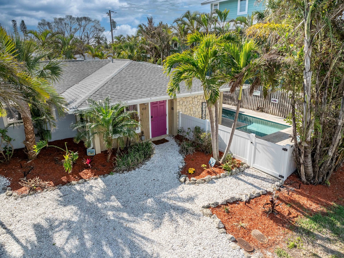 Charming Salty Harbor sits in a quaint, exclusive corner of AMI and boasts a private heated pool and ample parking for 2 vehicles and even a boat: -We typically have shorter stays available, just ask! -If you don't have a single 50Lb pet, please discuss it with us -One of the twin boutique MyAnnaMariaStay homes, look us up! You'll love the luxury mid-century feel, lush yard, and a 6-min walk to the beach, Publix or the trolley stop. AMI was voted a top 50 vacation spot in the world in 2024