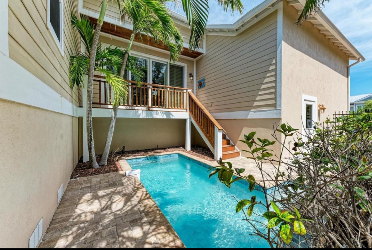 Elevated home with all the amenities. Walking distance to the beach, chairs and towels provided. Relax in the backyard patio, including pool with waterfall . The shaded balcony overlooks the pool if you need to escape the sunshine. There’s a free trolley that runs all day in AMI if you don’t want to take the car out. The house is located across the street from Bimini Bay, enjoy a jog through these side streets in the morning. Local shops and restaurants that will not disappoint .