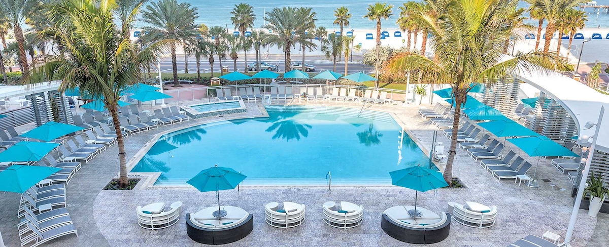 Oceanfront Pool & Private Beach Access – Clearwater Beach Escape – Clearwater Beach, FL Start your day with a sunrise walk along the beach, enjoy a refreshing dip in the pool, savor local seafood at nearby restaurants, and end your evening with breathtaking sunset views from your suite.