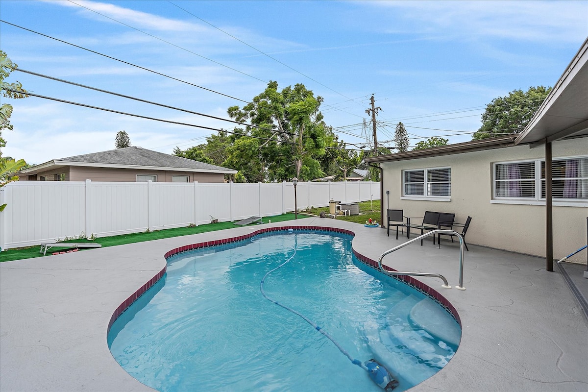 Welcome to your private, tropical escape! Unwind by the solar-heated pool in a screened, mosquito-free lanai. FUN & GAMES: Enjoy Billiards (Pool Table) 🎱, Foosball, Cornhole, board games, and 3 Smart TVs 📺. PRIME LOCATION: Only 5 min 🚗 to Indian Rocks & Bellaire Beach, FL Botanical Garden, and dining. Essentials: 🌞 Heated Swimming Pool (Private!) 🎮 Billiard Table / Foosball Table / Cornhole / Boardgames and more! 🛏️ 4 Queen/Full Beds 🧺 Beach Amenities