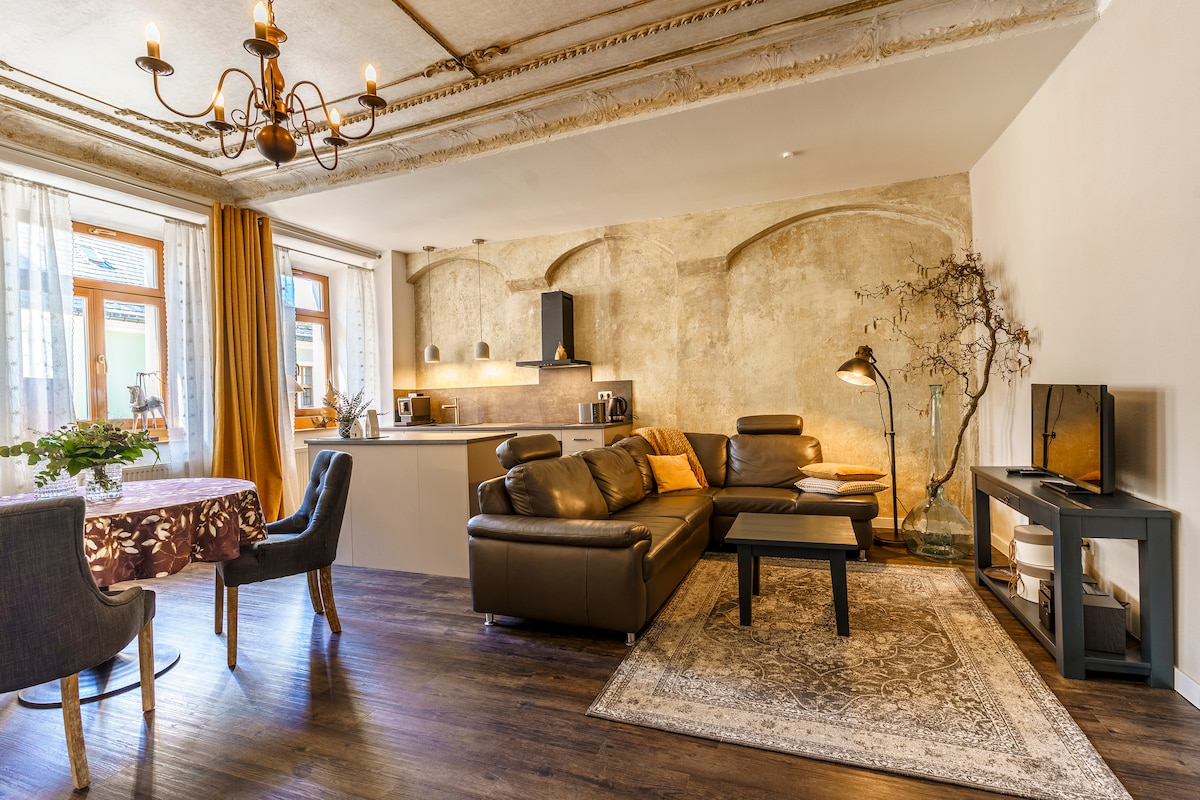 The apartment has a hallway, a bathroom with shower, a bedroom with a double bed and wardrobe, a small kitchenette and an adjoining living room area with a comfortable leather sofa and a large TV. The furnishings delight with a mix of traditional elements (e.g. a historical and reclaimed dining table) and modern comfort.