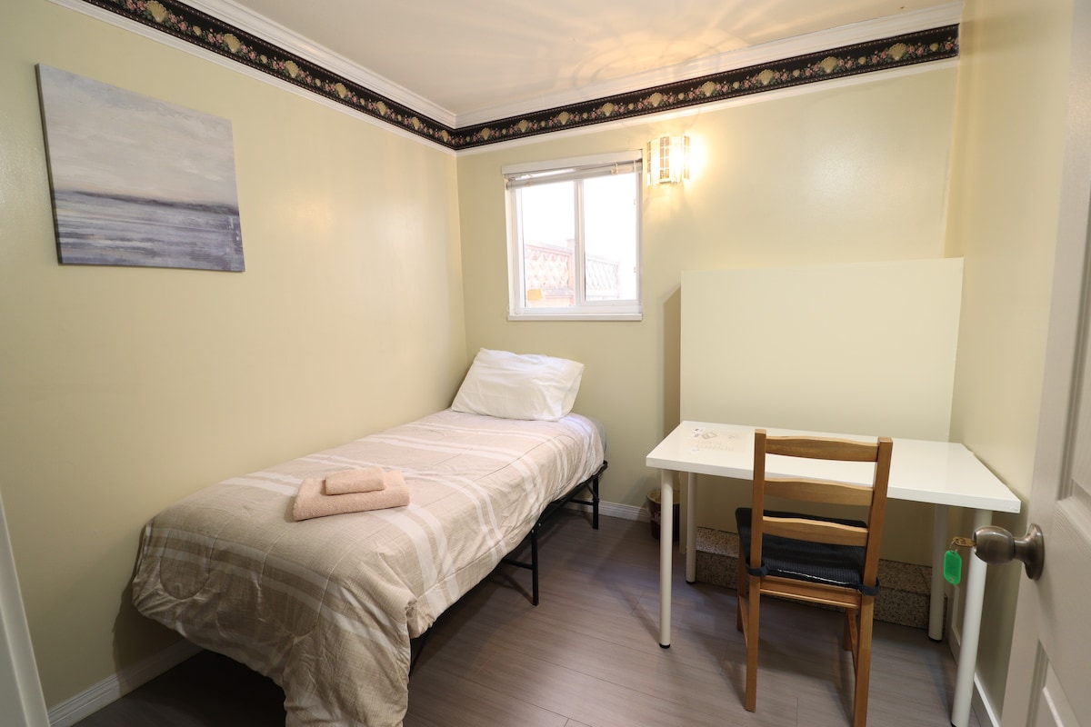 We specialize in short-term, last-minute, quick stays. Keyless entry makes 'check-in' hassle-free, even late at night. Welcome to your own Queen bedroom with private en-suite bath. We're happy to host you in this dedicated 'nanny suite,' in our home. Separate entrance in back garden, ensuite full bathroom. Workstation desk. Basic kitchenette amenities: fridge, microwave, basic dishes, kettle. (no kitchen) Simple space. Everything you need for a restful stay in beautiful Vancouver.