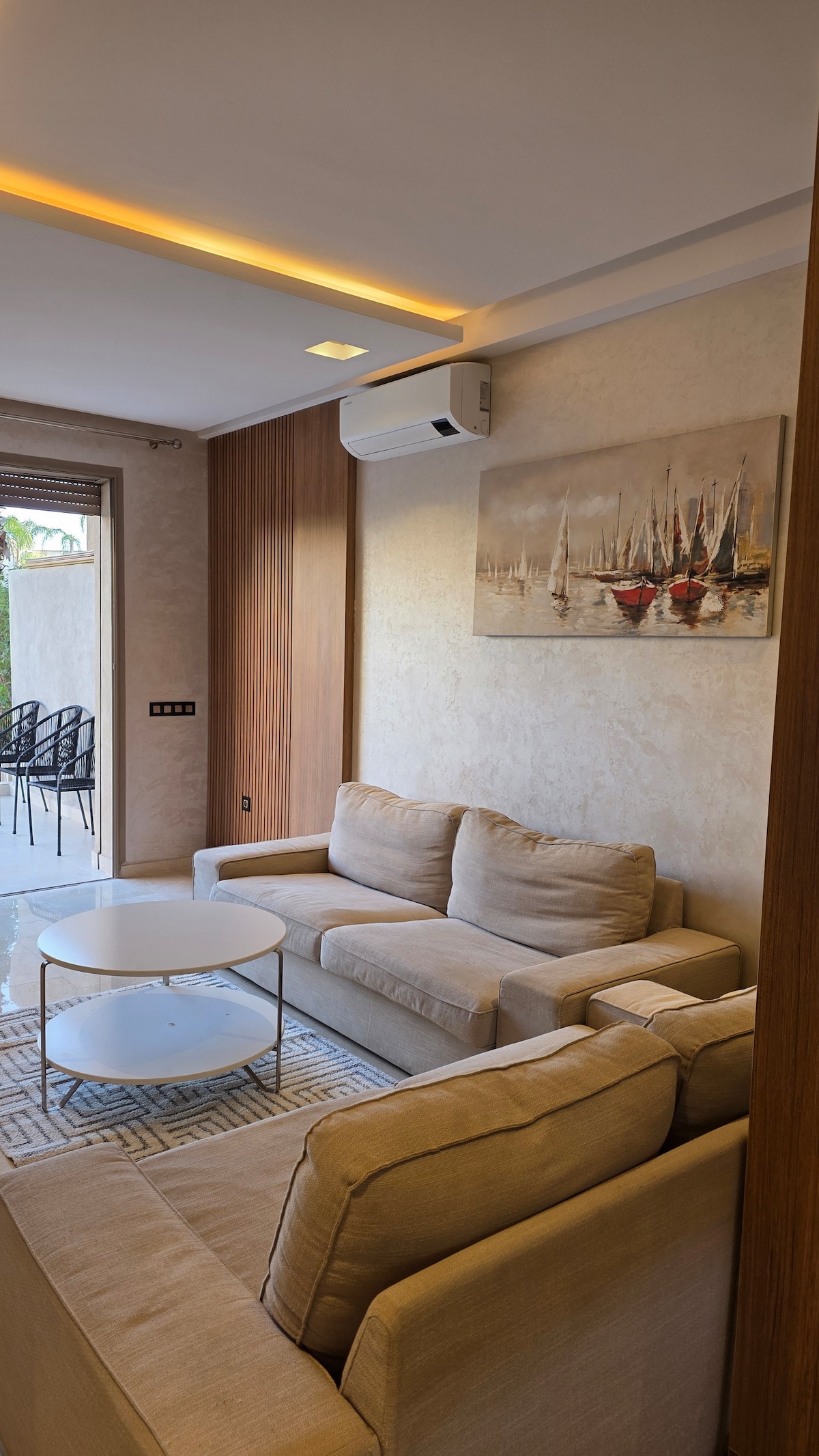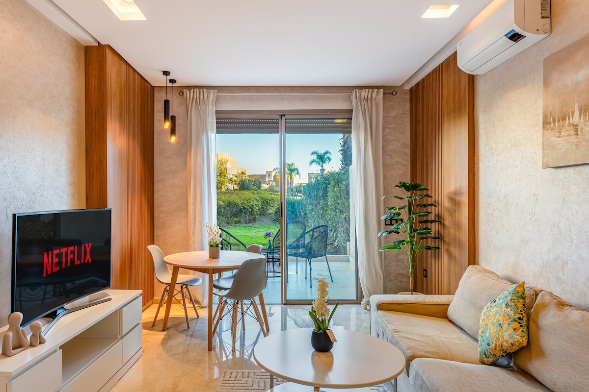 Charmant appartement avec terrasse et jardin privatif, à Atlas Golf Resort, une résidence calme et sécurisée située route de Fès, à une dizaine de minutes en voiture du centre de Marrakech. La résidence propose 2 piscines avec transats et parasols, de beaux jardins, une aire de jeux pour enfants et un city foot. Doté de 2 chambres, 2 salles de bains et d'une cuisine équipée, l'appartement est climatisé et peut accueillir jusqu'à 6 personnes. Il est doté du WIFI et d'une smart T.V. ( Netflix).