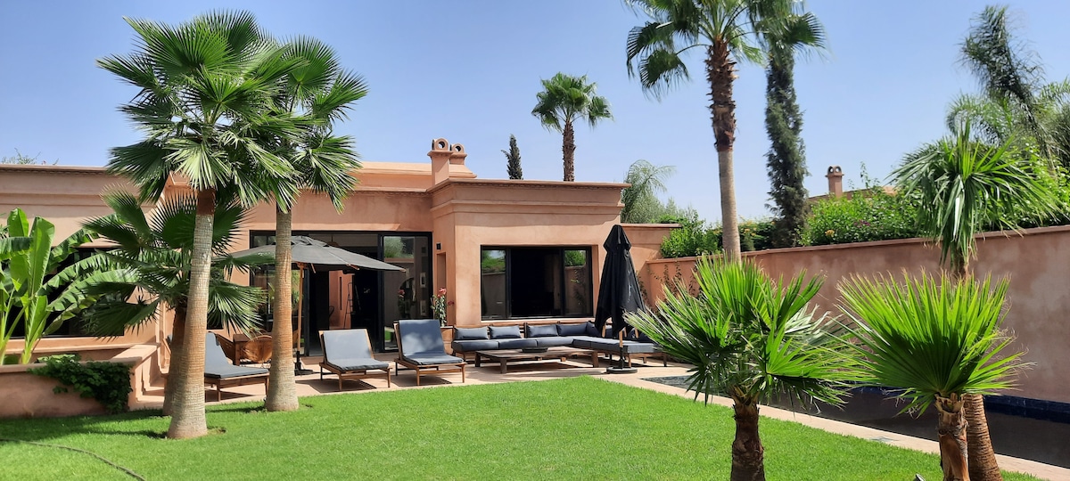 Villa située à +/- 30 minutes de Gueliz et de la médina dans un charmant domaine sécurisé 24/7 avec un terrain de tennis commun et de piscine privées. La villa se compose de 3 tres grandes suites avec chacune leur cheminée, leur télé (Netflix gratuit), 3 salles de bain, d'une petite piscine intérieure chauffée, d'une piscine extérieure privative et d'un jardin privatif sans vis à vis, d'un salon avec cheminée. Table à manger convertible en billard ou en table de ping-pong. Villa au calme.
