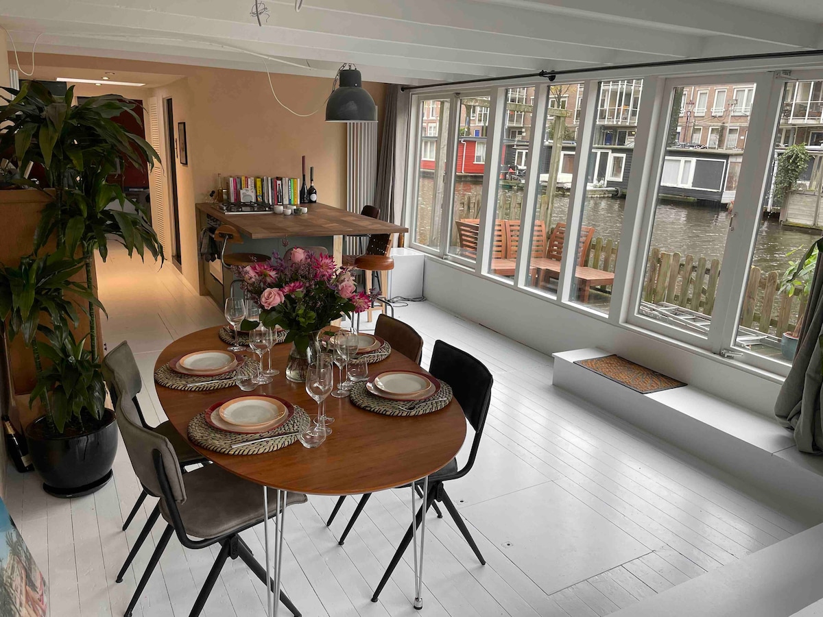 Welcome to our charming houseboat retreat in the heart of Amsterdam's historic Jordaan neighborhood! Experience the unique allure of living on the water while enjoying all the comforts of a cozy home. This delightful 25m2 suite on a typical Dutch houseboat offers all you need for a nice stay in Amsterdam, including a private bathroom, a small fridge, microwave, Nespresso machine, tea kettle, and a stylishly decorated interior.
