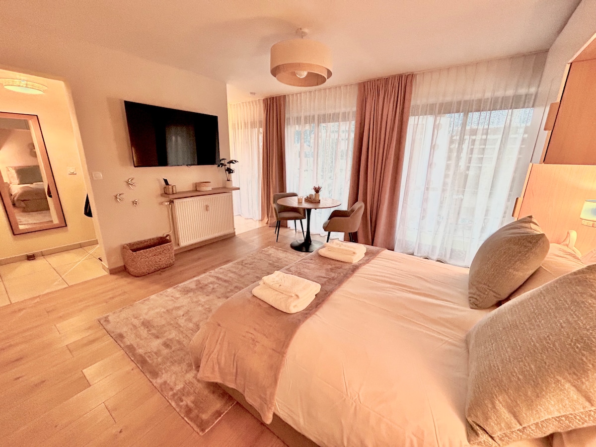 Large bright studio, quiet, just renovated, the Evasion offers a peaceful setting with natural and contemporary decoration creating a warm atmosphere. Ideally located 150 m from the lake, in a secure residence with elevator, on the 3rd floor, large balcony terrace, private underground parking and bicycles ( mountain bikes ) available. At the end of the street are all shops! The historic center is ten minutes walk, the lake 3 minutes. Sleeps 2 people : pne queen size bed